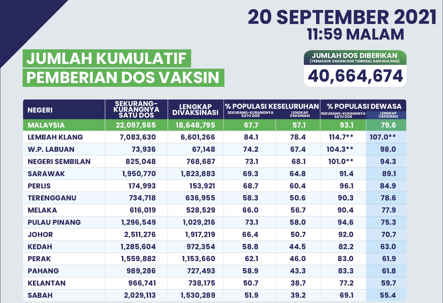 PUTRAJAYA 21 Sept. – Sasaran imuniti kelompok 80 peratus dalam kalangan populasi dewasa di negara ini semakin hampir apabila rekod setakat semalam mencapai 79.6 peratus atau 18.64 juta individu melengkapkan vaksinasi mereka. Sebanyak 93.1 peratus atau 22 juta individu pula telah menerima satu dos suntikan vaksin. Semalam, sejumlah 289,618 dos suntikan vaksin didaftarkan dan daripada jumlah itu, sebanyak 195,473 adalah bagi dos kedua dan 94,154 dos pertama. Ini menjadikan jumlah keseluruhan vaksin Covid-19 yang sudah didaftarkan adalah sebanyak 40.664 juta dos. Penambahan vaksin harian ini juga turut menyaksikan 57.1 peratus…