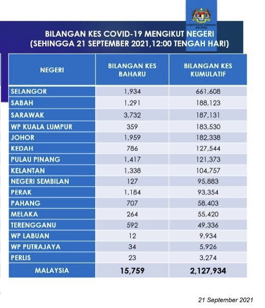 PUTRAJAYA 21 Sept. – Semua negeri merekodkan kes baharu Covid-19 termasuk Labuan yang dua hari berturut- turut merekodkan sifar kes mencatatkan 12 kes baharu yang menjadikan jumlah keseluruhan kes harian negara 15,759. Jumlah kumulatif sejak pandemik bermula pula meningkat kepada 2,112,175 orang. Berbanding semalam kebanyakan negeri merekodkan pertambahan kes kecuali Kedah, Pahang, Terengganu dan Perlis yang merekodkan penurunan kes. Tujuh negeri merekodkan pertambahan kes empat angka didahului Sarawak yang mencatatkan 3,732 kes, meningkat berbanding 3,611 semalam. Ini diikuti Johor 1,959 juga menunjukkan peningkatan berbanding 1,598 semalam, Selangor 1,934 (1,365), Pulau…