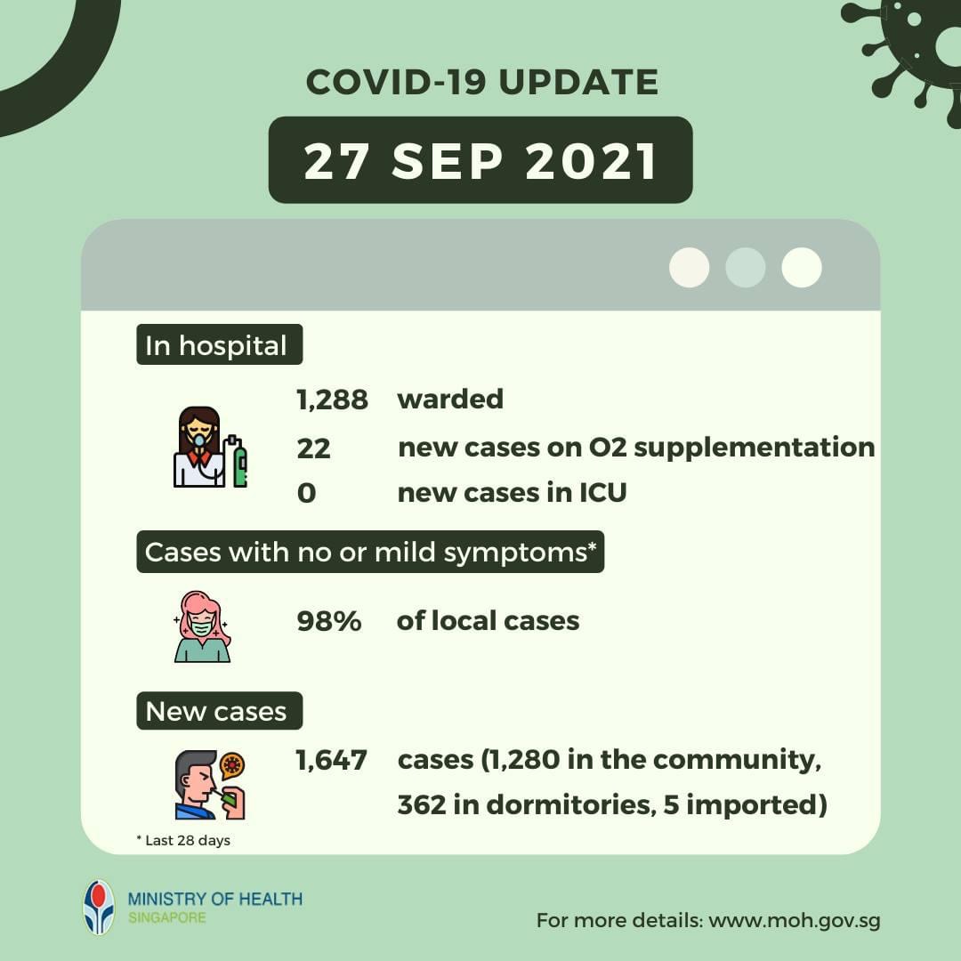 SINGAPURA 28 Sept. – Singapura melaporkan 1,647 kes baharu Covid-19 setakat tengah hari semalam iaitu hari ketujuh berturut-turut jumlah jangkitan harian melebihi 1,000 kes.