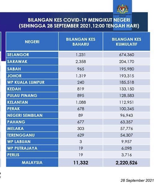 Sarawak merekodkan 2,358 kes, turun sedikit berbanding 2,723 semalam tetapi terus mendahului negeri-negeri lain yang menyumbang kepada jumlah keseluruhan kes harian negeri sebanyak 11,332 kes.