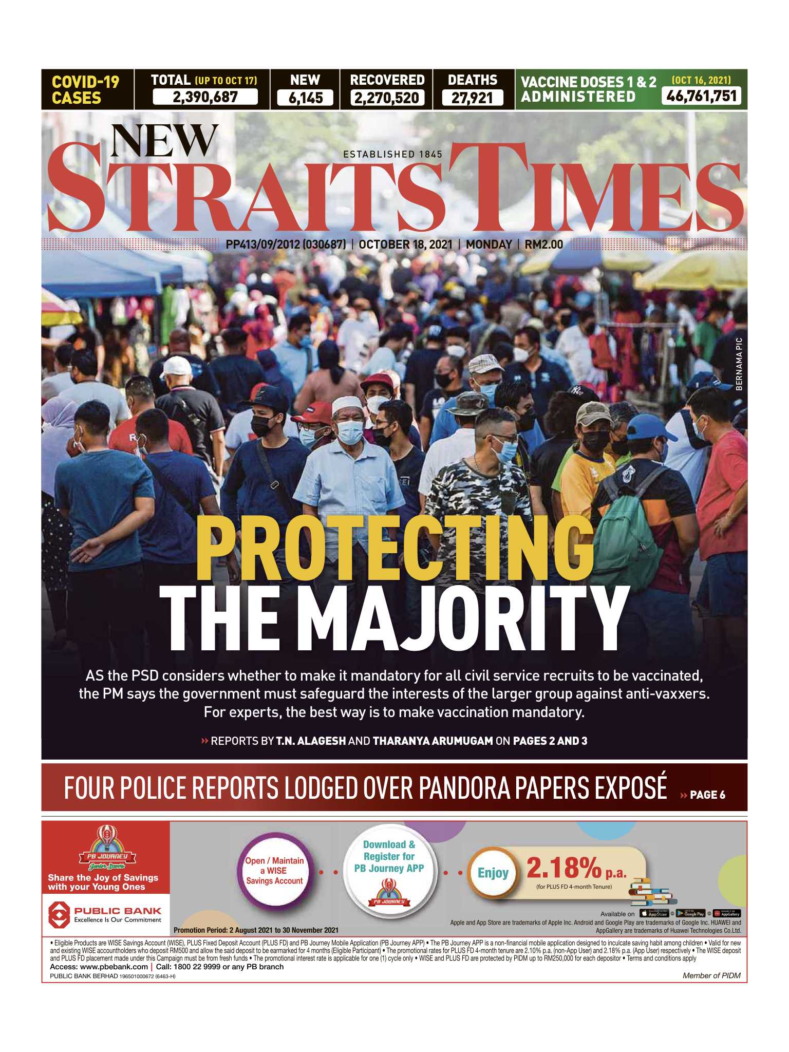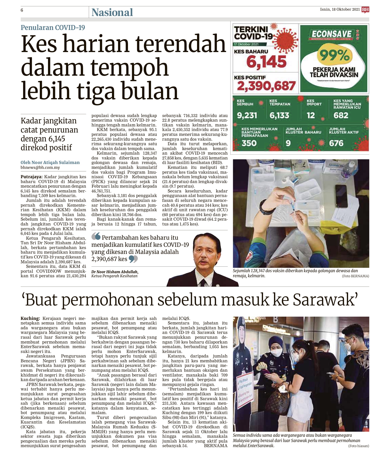 PUTRAJAYA 18 Okt. – Kes Covid-19 di Malaysia terus menunjukkan trend penurunan dengan 5,434 kes direkodkan dalam tempoh 24 jam, kata Ketua Pengarah Kesihatan, Dr Noor Hisham Abdullah. Katanya, kes terbaharu yang direkod pada hari ini merupakan yang terendah sejak 28 Jun lepas dan ini menjadikan jumlah keseluruhan kes kini 2,396,121. Semalam, Malaysia turut merekodkan penurunan dengan 6,145 kes. Menurut kenyataan media, Dr. Noor Hisham berkata, daripada 5,434 kes harian yang dilaporkan hari ini, sebanyak 151 kes (2.8 peratus) adalah kategori 3, 4, dan 5; dan 5,283 kes (97.2 peratus) lagi…