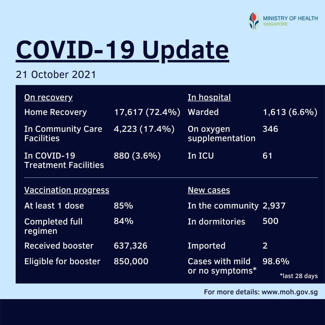 SINGAPURA 22 Okt. – Singapura melaporkan 3,439 kes baharu Covid-19 setakat tengah hari semalam dan 16 lagi kematian disebabkan komplikasi akibat virus itu yang membawa kepada jumlah keseluruhan 162,026 kes dan 280 kematian. Dalam kalangan kes baharu itu, 3,437 adalah jangkitan dalam negeri, meliputi 2,937 jangkitan dalam masyarakat dan 500 di asrama pekerja asing serta dua kes import. Menurut Kementerian Kesihatan (MoH), kematian terbaharu melibatkan 12 lelaki dan empat wanita yang berusia antara 61 tahun dengan 93 tahun. Lapan daripada mereka belum divaksin sama sekali, seorang sudah menerima satu dos…