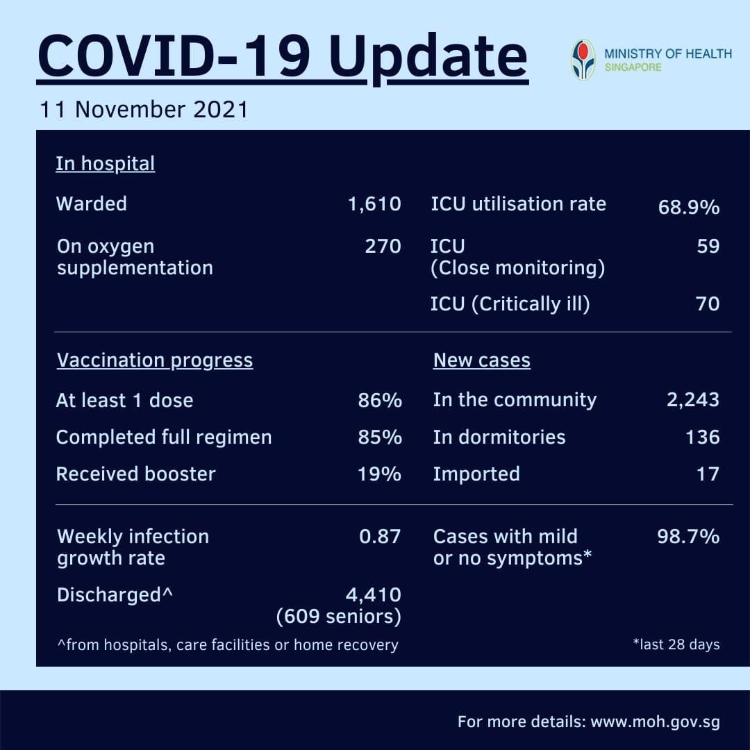 SINGAPURA 12 Nov. – Kementerian Kesihatan (MoH) melaporkan 2,396 kes baharu Covid-19 di Singapura setakat 12 tengah hari Khamis semalam dengan jumlah kematian pula lapan orang. Jumlah kes itu menunjukkan penurunan berbanding 3,481 pada Rabu dan 3,397 kes pada Selasa manakala jumlah keseluruhan pula Daripada jumlah kes harian itu, sebanyak 2,243 adalah kes dalam masyarakat:, 17 kes import, dan 136 kes baharu di asrama pekerja asing. Kes kematian pula melibatkan individu berusia 74 hingga 100 tahun dan kesemua yang meninggal dunia disebabkan oleh komplikasi akibat jangkitan Covid-19. Mereka juga mengalami…
