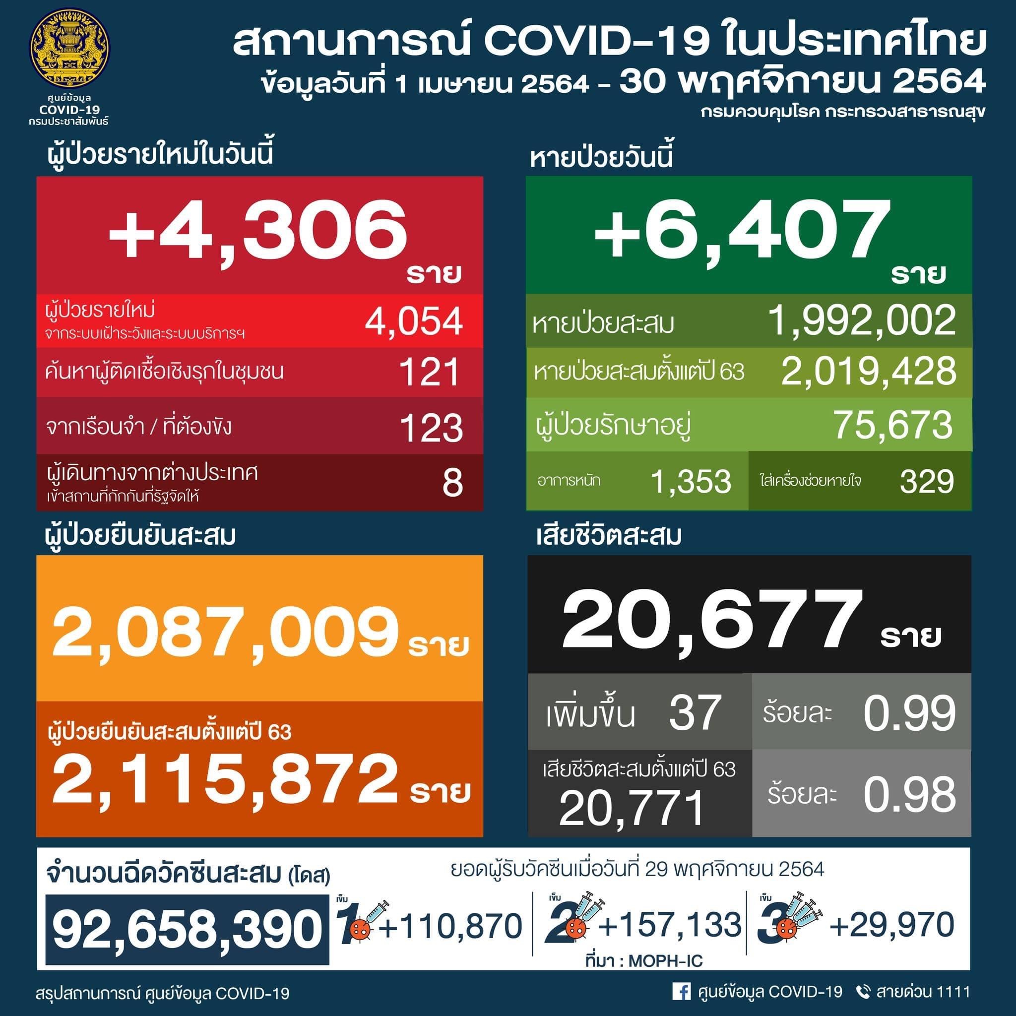 BANGKOK 30 Nov. – Dalam tempoh 24 jam, Thailand merekodkan 4,306 kes baharu Covid-19 dan 37 kematian, yang kedua-duanya menunjukkan penurunan berbanding semalam yang merekodkan 4,753 kes dan 27 kematian.