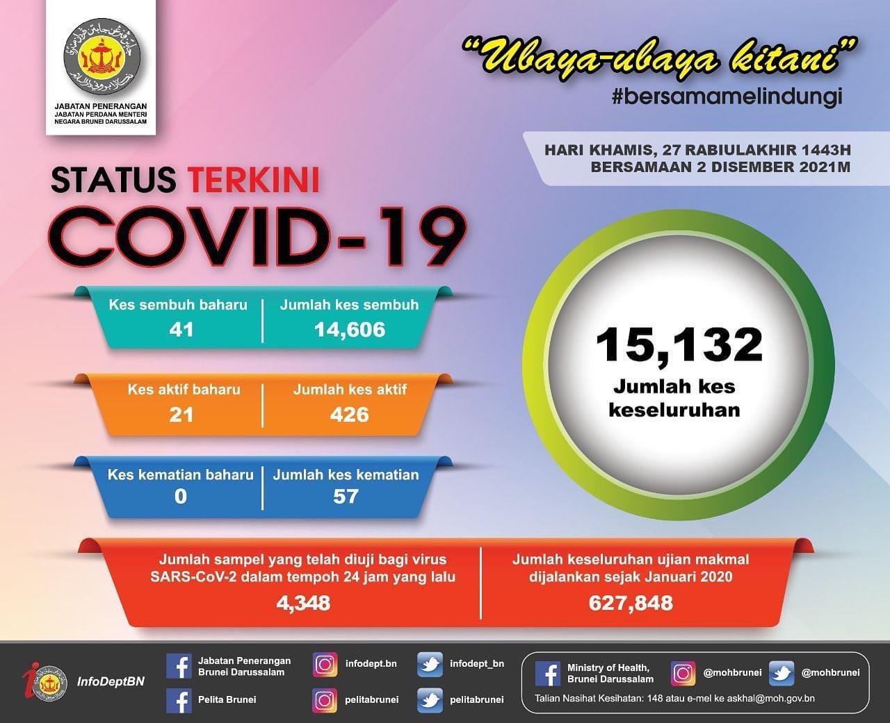 BERAKAS 2 Dis. – Brunei Darussalam merekodkan satu kematian dan 21 kes baharu Covid-19 dalam tempoh 24 jam yang menjadikan jumlah keseluruhan kes meningkat kepada 15,132.