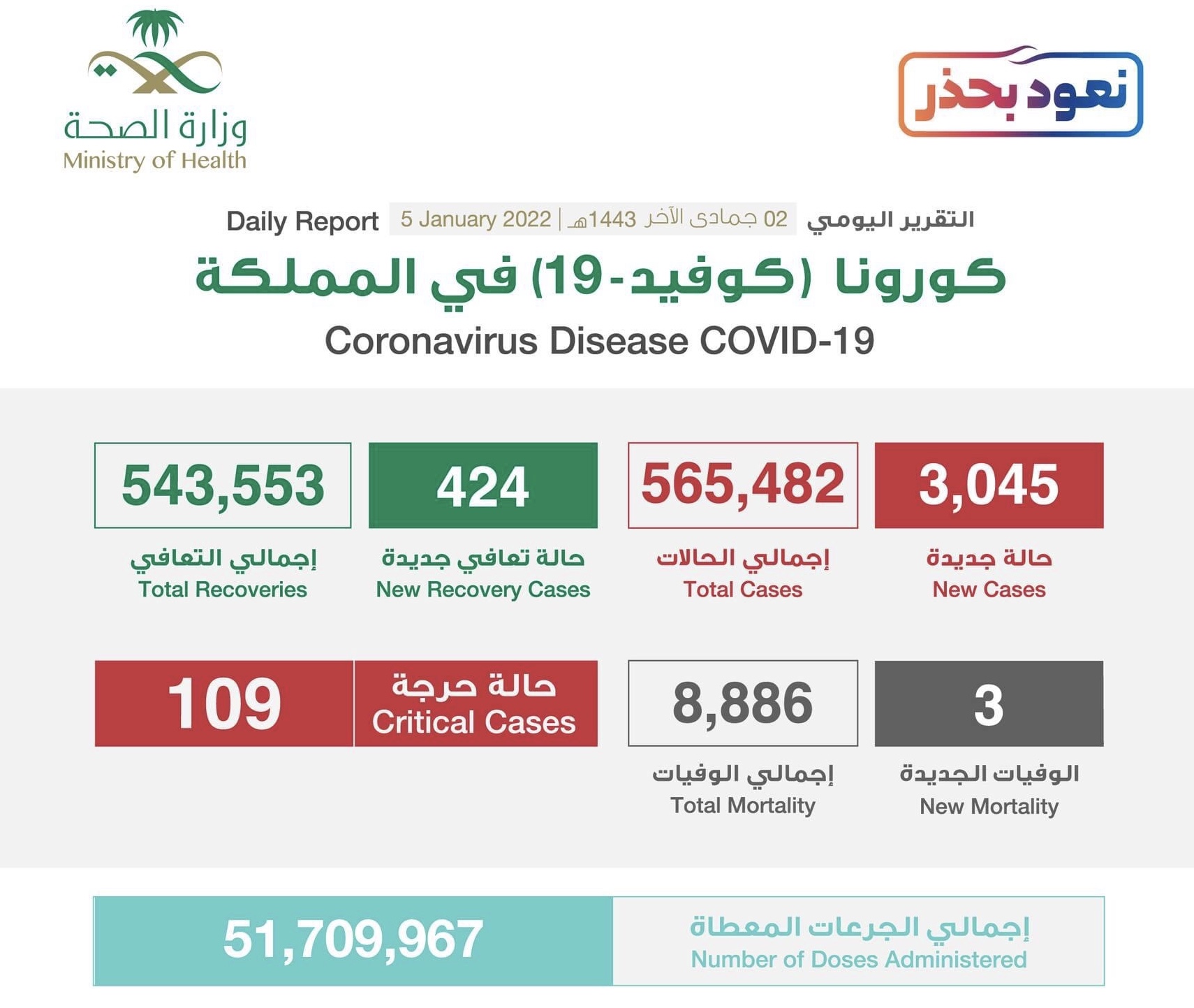 RIYADH 5 Jan. – Arab Saudi terus mencatatkan lonjakan kes Covid-19 apabila jumlahnya melepasi angka 3,000 dengan merekodkan 3,054 kes berbanding 2,585 yang dilaporkan semalam. Ini bermakna tiga hari berturut-turut, jumlah kes merekodkan peningkatan ketara di mana pada Isnin sebanyak 1,746 kes direkodkan dan sebelumnya 1,024 (2Januari) dan 846 (1 Januari). Menurut Kementerian Kesihatan, tiga lagi meninggal dunia dalam tempoh 24 jam yang lalu berbanding dua kes semalam. Dengan perkembangan ini, jumlah keseluruhan kes meningkat kepada 565,482 orang manakala 8,886 orang telah meninggal dunia. Sebanyak 424 pesakit dilaporkan sembuh menjadikan…