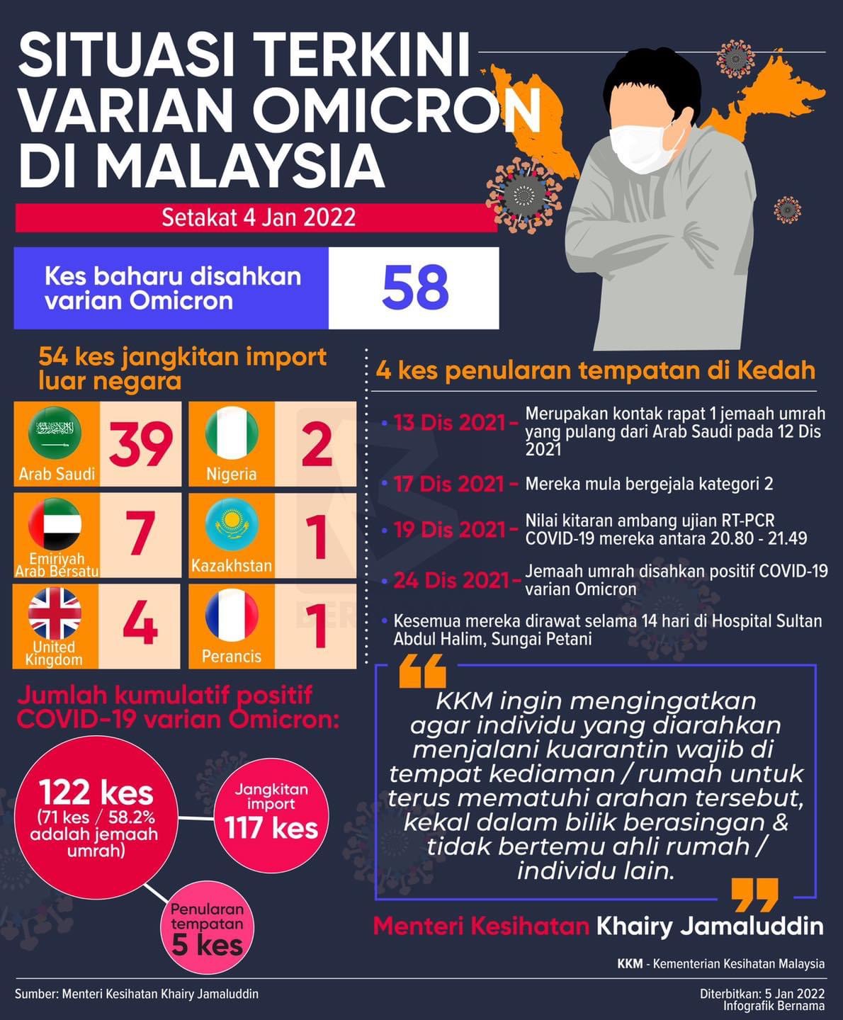 PUTRAJAYA 5 Jan. – Sebanyak 76.1 peratus atau 928 daripada 1,220 kes positif Covid-19 berkemungkinan varian Omicron yang direkodkan bulan lalu membabitkan jemaah umrah. Ketua Pengarah Kesihatan, Dr Noor Hisham Abdullah, berkata data itu diperoleh hasil ujian PCR Genotyping Assay oleh Institut Penyelidikan Perubatan (IMR). Katanya, ujian itu dibuat terhadap 1,774 kes positif Covid-19 membabitkan pengembara yang tiba di negara ini pada bulan berkenaan. “Ujian PCR Genotyping Assay dijalankan oleh IMR ke atas 1,774 kes positif Covid-19 dalam kalangan pengembara yang tiba di Malaysia untuk tempoh 1 hingga 31 Disember…