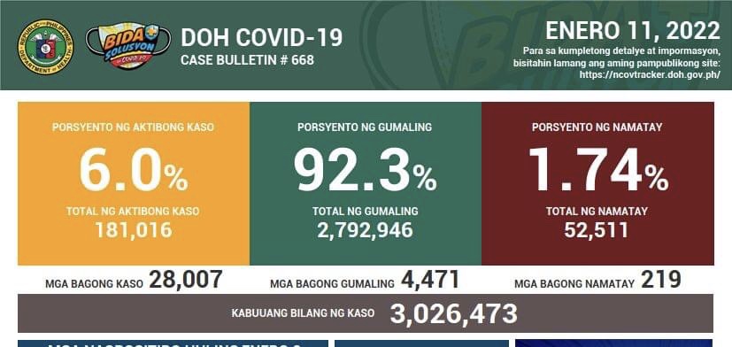 MANILA 11 Jan. – Jumlah keseluruhan kes jangkitan Covid-19 di Filipina kini mencecah 3,026,473 selepas 28,007 kes baharu direkodkan hari ini berbanding