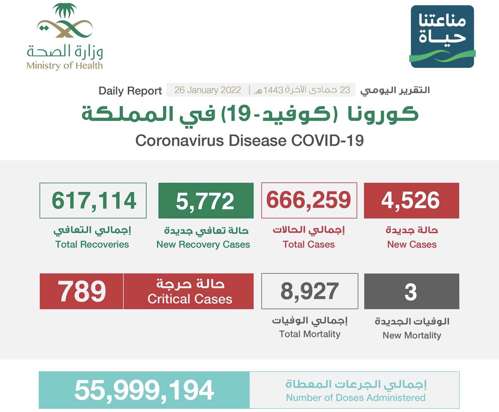 RIYADH 26 Jan. – Jumlah kes harian Covid-19 di Arab Saudi turun sedikit dengan merekodkan 4,526 kes berbanding semalam 4,541 menjadikan jumlah keseluruhan meningkat kepada 666,259 kes. Bagaimanapun jumlah kematian yang direkodkan hari ini adalah tiga orang berbanding dua semalam menjadikan jumlah keseluruhan 8,927 kematian. Riyadh merekodkan kes harian tertinggi berbanding bandar lain iaitu 1,489 kes diikuti Jeddah 472, Hofuf 198, Makkah 194, Madinah 139, Dammam 137, dan Jazan 119. Menurut Kementerian Kesihatan, sebanyak 5,772 orang dilaporkan sembuh dalam tempoh 24 jam yang membawa kepada jumlah pesakit pulih meningkat kepada…
