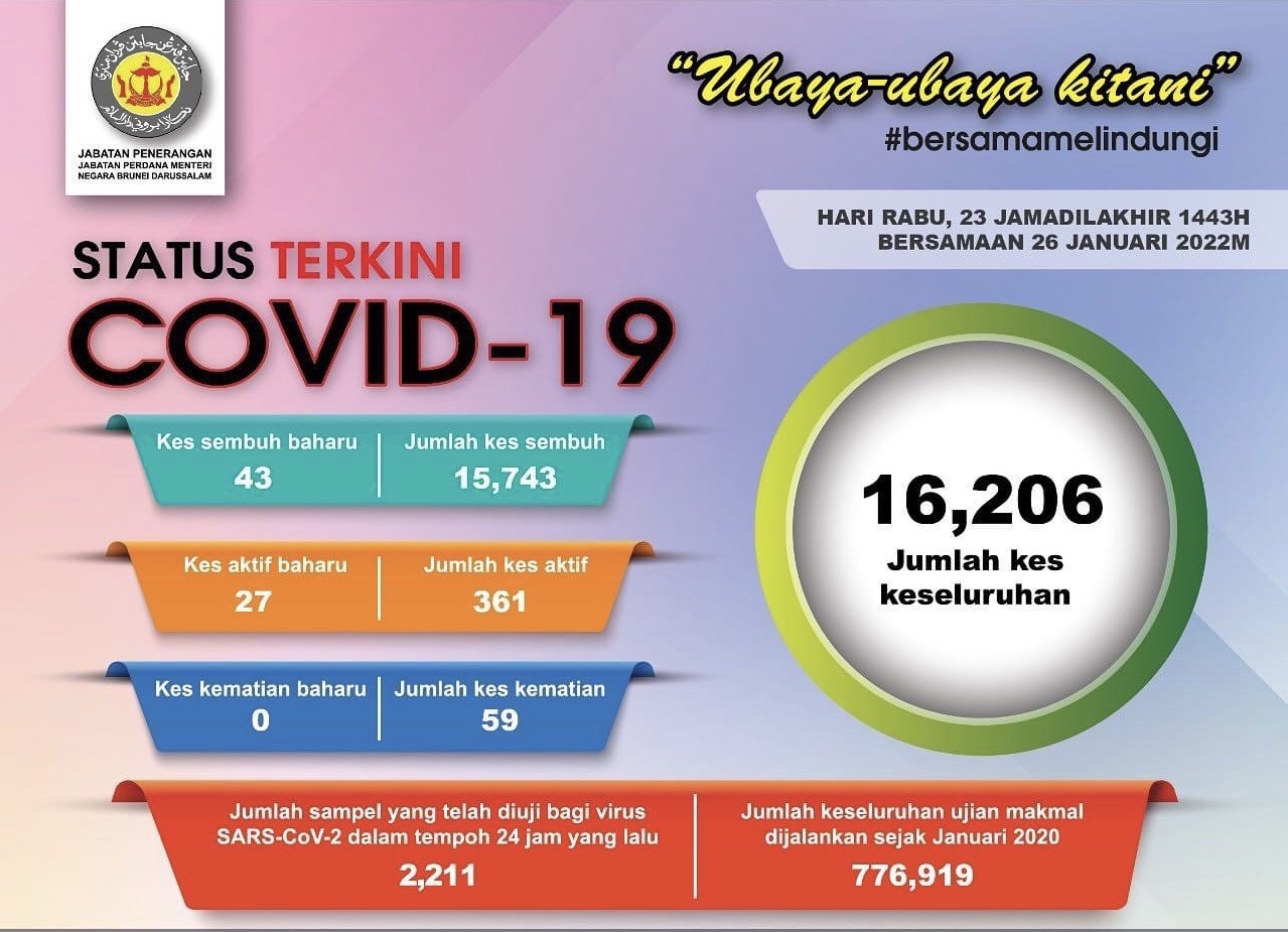 BERAKAS 26 Jan. – Sebanyak 27 kes baharu jangkitan Covid-19 disahkan di Brunei Darussalam, hari ini menjadikan jumlah keseluruhan meningkat kepada 16,206 orang, kata Menteri Kesihatan, Dr Md Isham Jaafar. Daripada jumlah itu, sebanyak 24 adalah kes tempatan, manakala tiga lagi adalah kes import. “Jumlah kes baharu ini adalah hasil daripada 2,211 jumlah ujian makmal, yang dilakukan dalam tempoh 24 jam lalu. Oleh itu, kadar kes positif pada hari ini ialah sebanyak 1.2 peratus,” katanya. Menurut Dr. Md Isham, dalam kalangan kes-kes yang sedang dirawat di Pusat Pengasingan Kebangsaan, tiada…