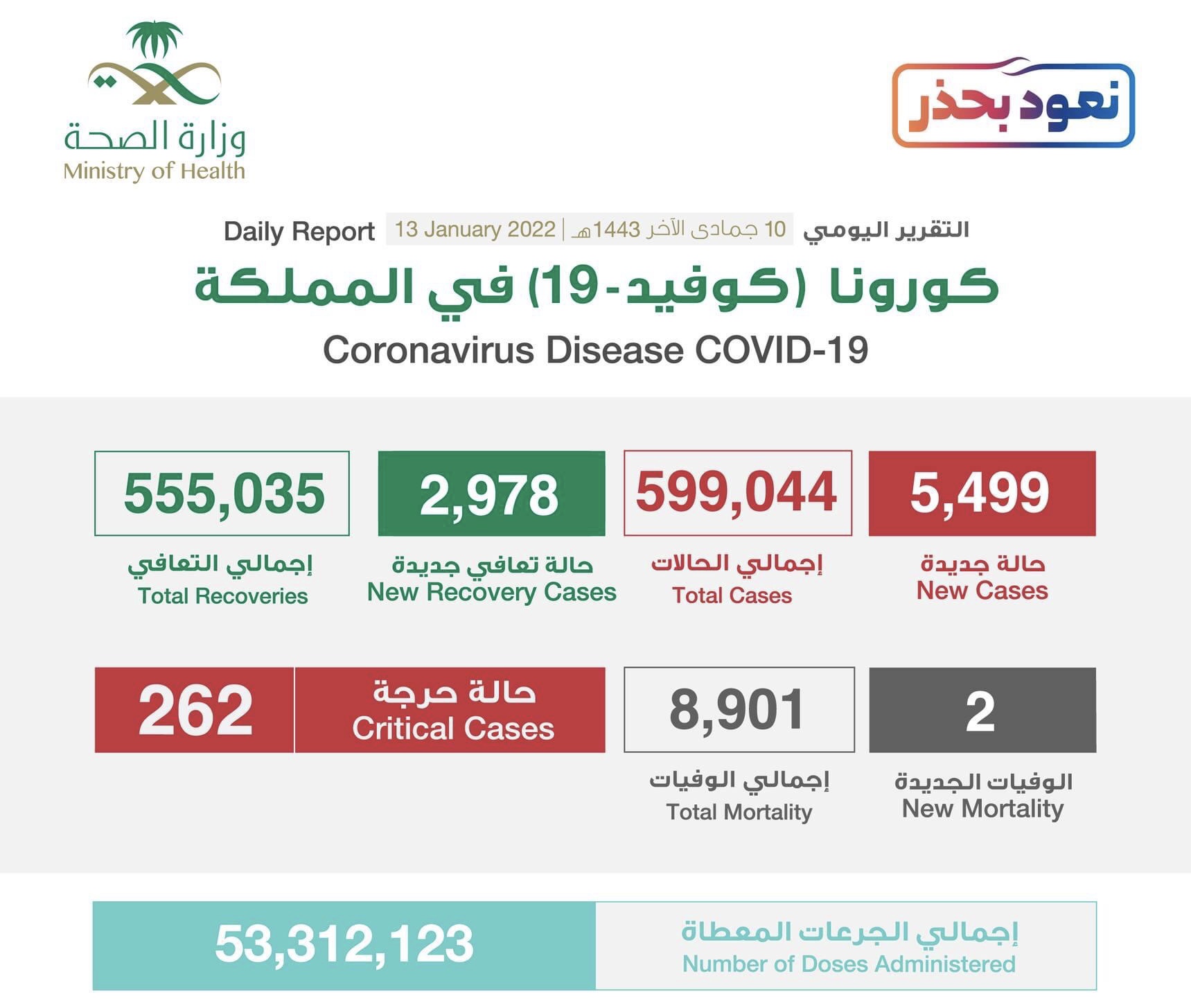 RIYADH 13 Jan. – Masih melebihi 5,000 kes Covid-19, Arab Saudi hari ini mencatatkan 5,499 kes baharu sekali gus mengatasi rekod harian tertinggi yang dicatatkan semalam sebanyak 5,362. Hari ini hari kedua Arab Saudi melepasi angka 5,000 menjadikan jumlah keseluruhan kes meningkat kepada 599,044 kes. Daripada kes harian itu, Riyadh merekodkan kes harian tertinggi iaitu 1,565 kes diikuti Jeddah 877, Makkah 474, Madinah 239, Dammam 198, Taif 137, Qatif 110, Al-Khobar 103, Hofuf 102, dan Khulais 100. Beberapa bandar lain merekodkan kurang daripada 100 kes. Jumlah kematian bagaimanapun masih bertahan…