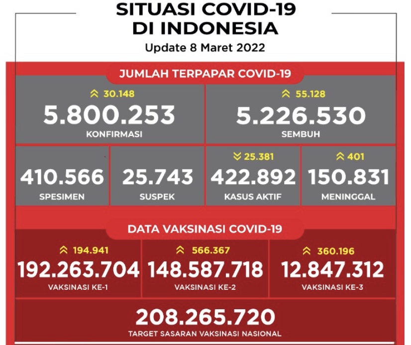JAKARTA 8 Mac – Sebanyak 30,148 kes baharu Covid-19 direkodkan yang melibatkan 29,589 kes tempatan dan 559 kes Pelaku Perjalanan Luar Negeri (PPLN) yang membawa kepada jumlah keseluruhan 5,800,253 kes. Angka kesembuhan pula sebanyak 55,128 melibatkan 54,875 jangkitan tempatan dan 253 PPLN yang membawa kepada jumlah keseluruhan 5,226,530. Jumlah kes aktif pula sebanyak 25,381 yang jumlah kumulatifnya 422,892 Kes kematian pula bertambah 401 yang terdiri 400 kes tempatan dan satu PPLN dengan kumulatifnya mencapai 150,831. Jawa Tengah merekodkan 136 kematian, Jawa Timur 58, Sumatera Utara 27, DKI Jakarta 26, dan…