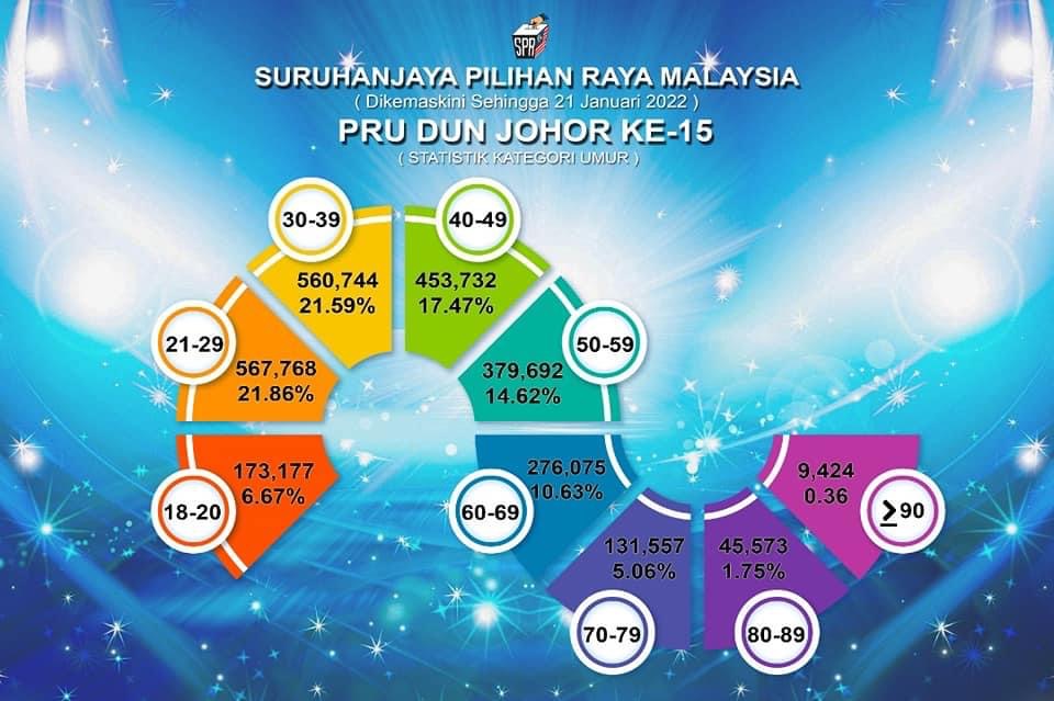 Jumlah pengundi di Johor mencatatkan peningkatan kira-kira 28 peratus berbanding hanya 1.8 juta pengundi pada Pilihan Raya Umum Ke-14 (PRU-14) dengan penambahan 749,731 pengundi berusia 18 tahun ke atas susulan pendaftaran automatik Undi18.