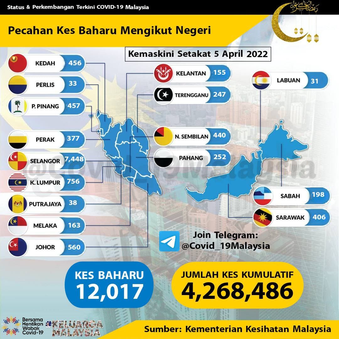 Daripada 12,017 kes harian yang dilaporkan pada 5 April 2022: