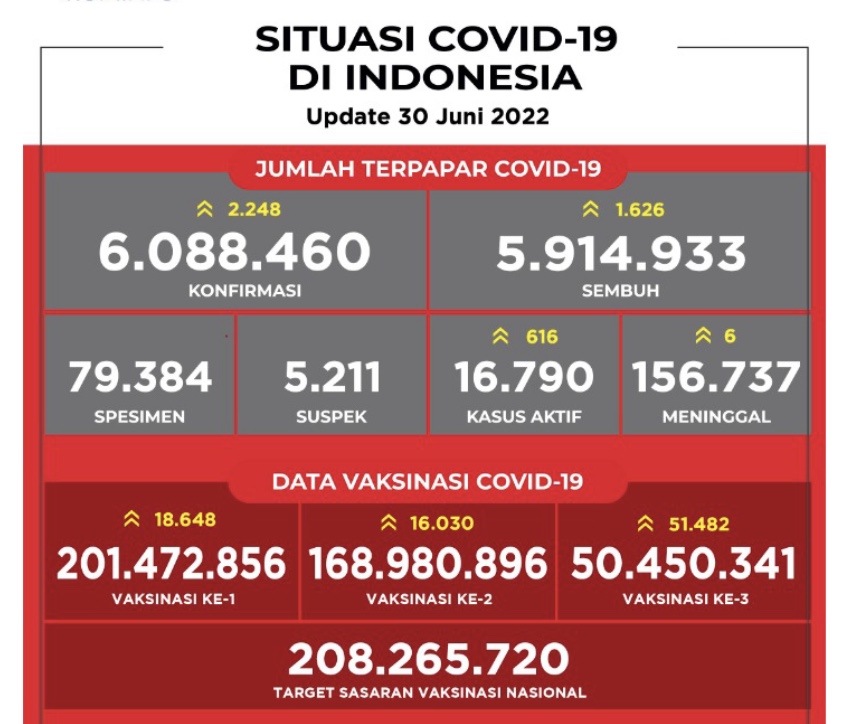 INDONESIA merekodkan 2,248 kes baharu Covid-19 hari ini, 30 Jun menjadikan jumlah keseluruhan 6,088,460. Enam lagi dilaporkan meninggal dunia yang membawa kepada jumlah keseluruhan 156,737 kematian setakat ini