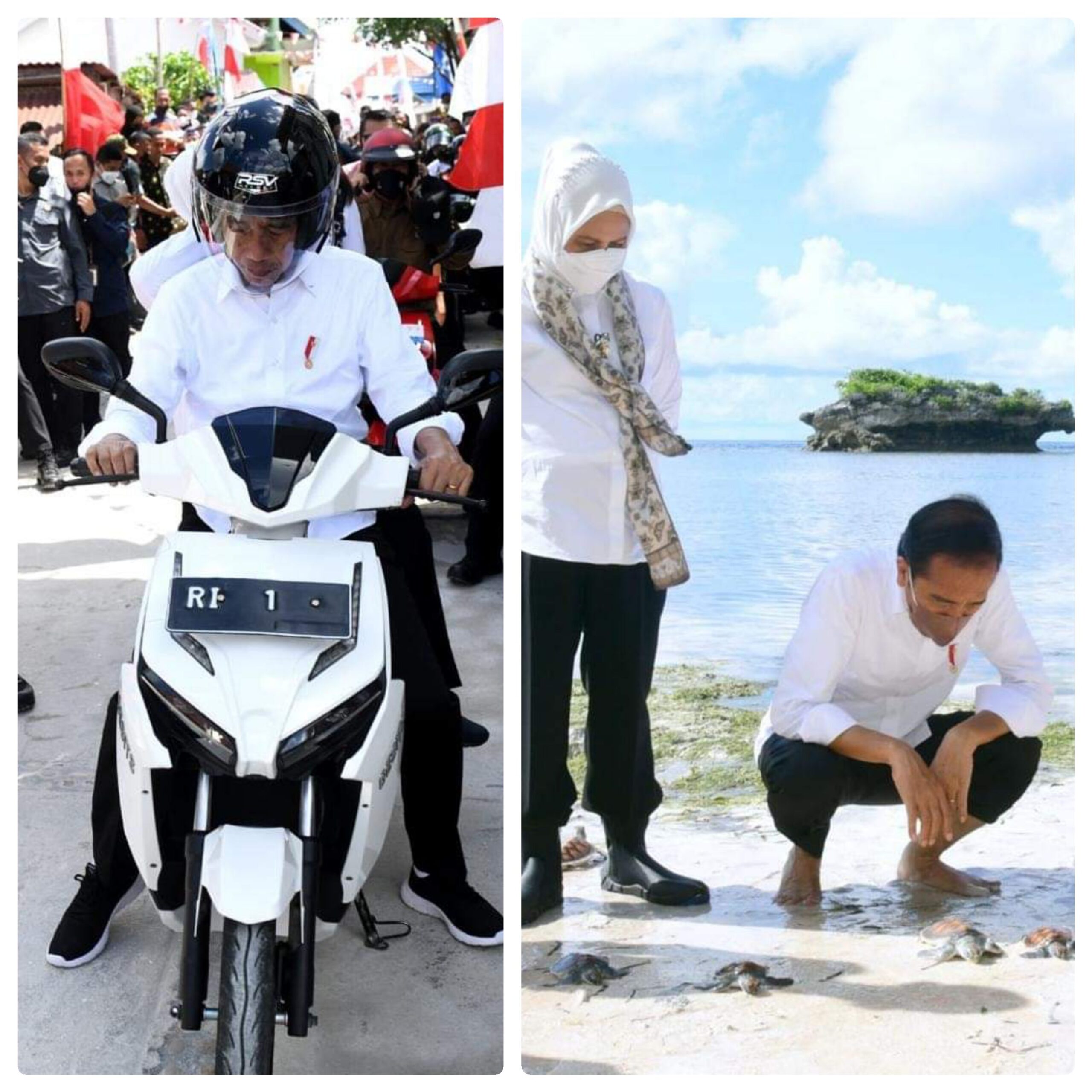 PRESIDEN Indonesia ketika lawatan turun padang turut hadir bersama para pelajar dan masyarakat melepaskan anak penyu ke laut bebas.
