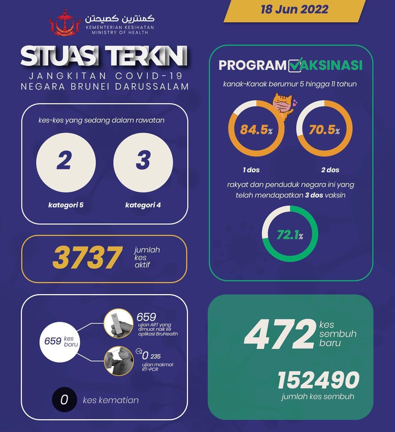 BANDAR SERI BEGAWAN 18 Jun. – Sebanyak 659 kes baharu Covid-19 direkodkan Brunei Darussalam hari ini, menunjukkan peningkatan berbanding 519 kes yang dilaporkan semalam. Kes baharu yang dilaporkan tersebut adalah hasil daripada Ujian ART yang dimuat naik ke aplikasi BruHealth. Dalam kenyataan media Kementerian Kesihatan bagi Situasi Terkini Jangkitan Covid-19 Negara Brunei Darussalam (NBD), dua kes sedang berada dalam Kategori 5, iaitu mereka yang memerlukan rawatan di Unit Rawatan Intensif (ICU). Tiga kes lagi dalam Kategori 4, iaitu mereka yang memerlukan bantuan oksigen dan di bawah pemantauan rapi. Sebanyak 472…