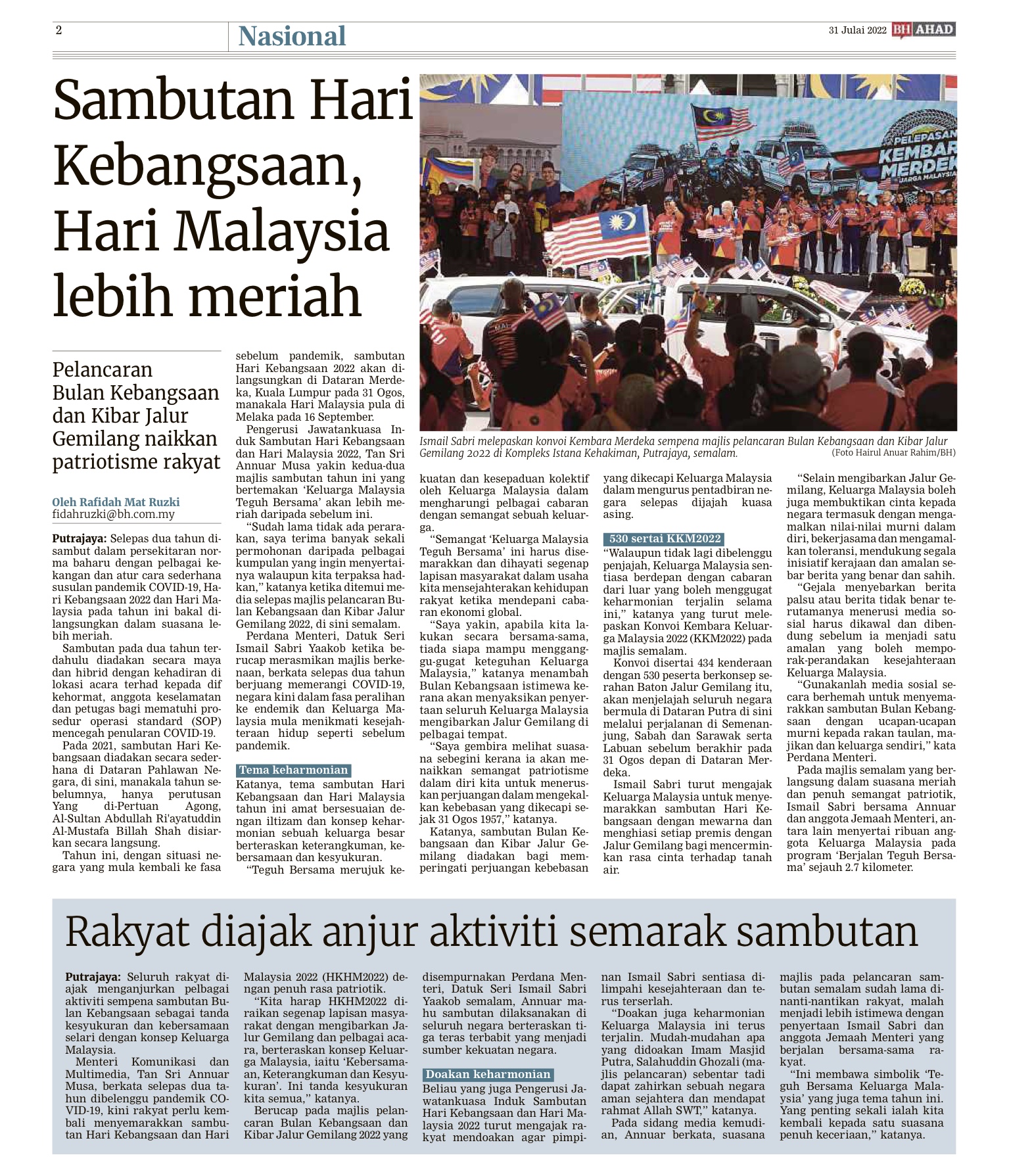 PUTRAJAYA 31 Julai – Yang di-Pertuan Agong, Al-Sultan Abdullah Ri’ayatuddin Al-Mustafa Billah Shah dan Raja Permaisuri Agong, Tunku Hajah Azizah Aminah Maimunah Iskandariah, hari ini berkenan berangkat ke istiadat perbarisan sambutan Hari Pahlawan Tahun 2022 di Dataran Pahlawan Negara, di sini. Istiadat sambutan Hari Pahlawan dimulakan dengan perarakan masuk Panji-panji Seri Paduka Baginda Yang di-Pertuan Agong dan Panji-panji Rejimen daripada Batalion Pertama, Rejimen Askar Melayu Diraja oleh Kawalan Kehormatan Utama terdiri daripada empat pegawai dan 103 anggota lain-lain pangkat. Lagu Negaraku dimainkan dengan diiringi 21 das tembakan meriam yang disempurnakan…