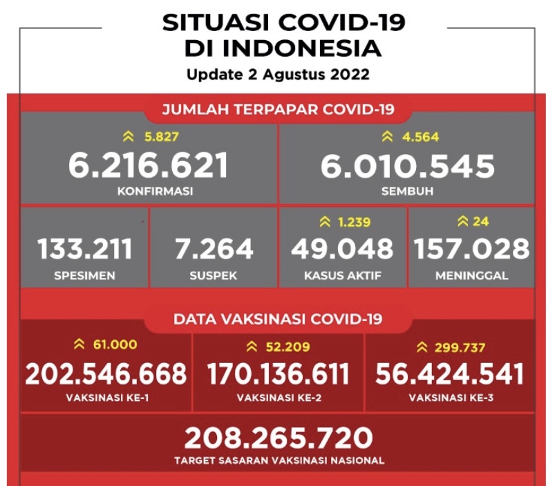 JAKARTA 2 Ogos – Indonesia merekodkan 5,827 kes baharu Covid-19 hari ini termasuk 123 kes import yang membawa kepada jumlah keseluruhan meningkat kepada 6,216,621 sejak kes pertama diumumkan.