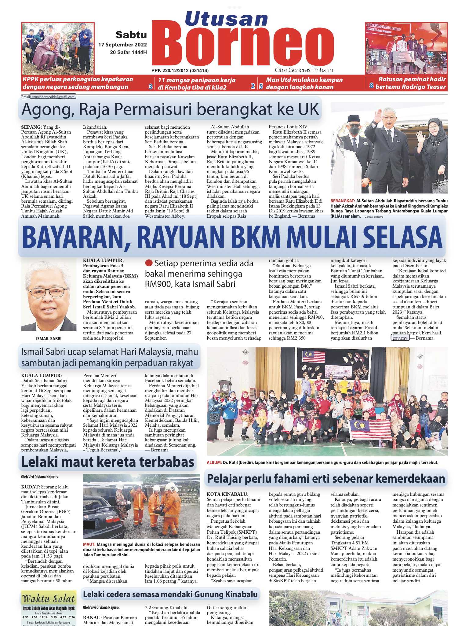 PUTRAJAYA 17 Sept. – Perdana Menteri, Ismail Sabri Yaakob menyifatkan sambutan Hari Malaysia 2022 peringkat kebangsaan amat meriah dan menjadi manifestasi kebangkitan negara selepas bergelut dengan pelbagai cabaran pada tahun-tahun sebelumnya. Katanya, sambutan di Dataran Memorial Pengisytiharan Kemerdekaan Banda Hilir, Melaka malam tadi sungguh bermakna, dan mengimbau kembali detik-detik laungan kemerdekaan oleh perdana menteri pertama, Tunku Abdul Rahman Putra Al-Haj. “Saya bangga dengan penganjuran Hari Malaysia yang penuh gilang-gemilang ini. Terima kasih Keluarga Malaysiaku,” katanya menerusi catatan di akaun Facebook, hari ini. Sambutan Hari Malaysia itu menampilkan keunikan tema busana…