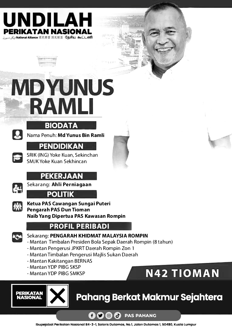 ROMPIN 19 Nov. – Calon Perikatan Nasional (PN) Dewan Undangan Negeri (DUN) Tioman Md Yunus Ramli, 61 meninggal dunia kira-kira pukul 3.30 pagi ini di Hospital Rompin, Pahang. Menurut laporan Bernama, kematian itu disahkan Ahli Jawatankuasa Pas Pusat, Wan Rohimi Wan Daud. Md Yunus, daripada Pas yang sebelum ini pernah bertanding di kerusi sama pada PRU14 merupakan Ketua Pas Cawangan Sungai Puteri dan Pengarah 2 Jawatankuasa Pilihan Raya Kecil DUN Tioman. Allahyarham juga merupakan bekas Timbalan Presiden Bola Sepak Daerah Rompin. Hari ini adalah hari pengundian bagi Pilihan Raya Umum…