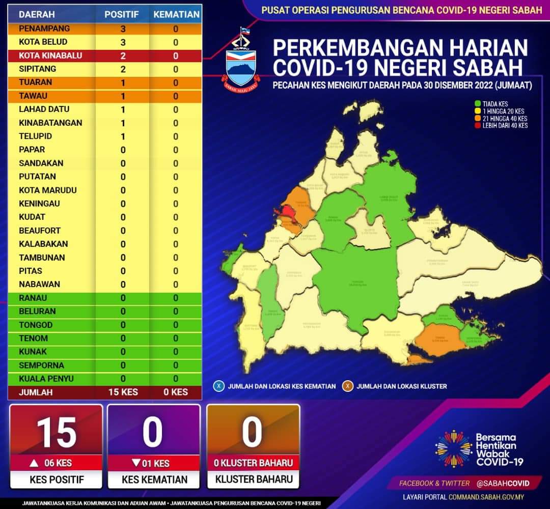 Hari ini, sebanyak 15 kes baharu iaitu bertambah enam kes direkodkan daripada 1,228 sampel ujian berbanding 1,251 ujian semalam dengan kadar positiviti 1.22 peratus, berbanding 0.72 peratus semalam.