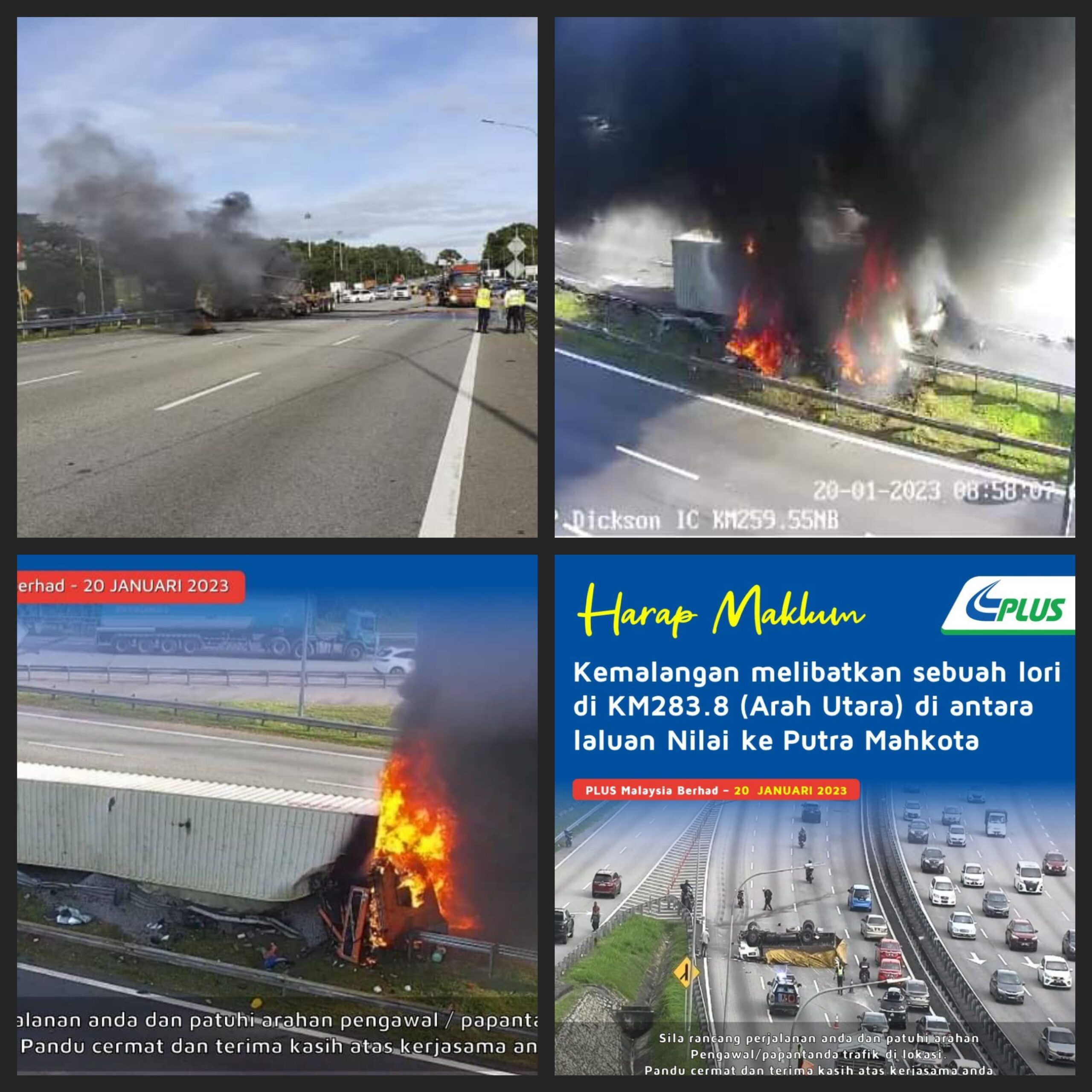 Sementara itu satu lagi kemalangan dilaporkan di KM283.8 (arah utara) yang melibatkan sebuah lori di antara laluan Nilai ke Putra Mahkota.