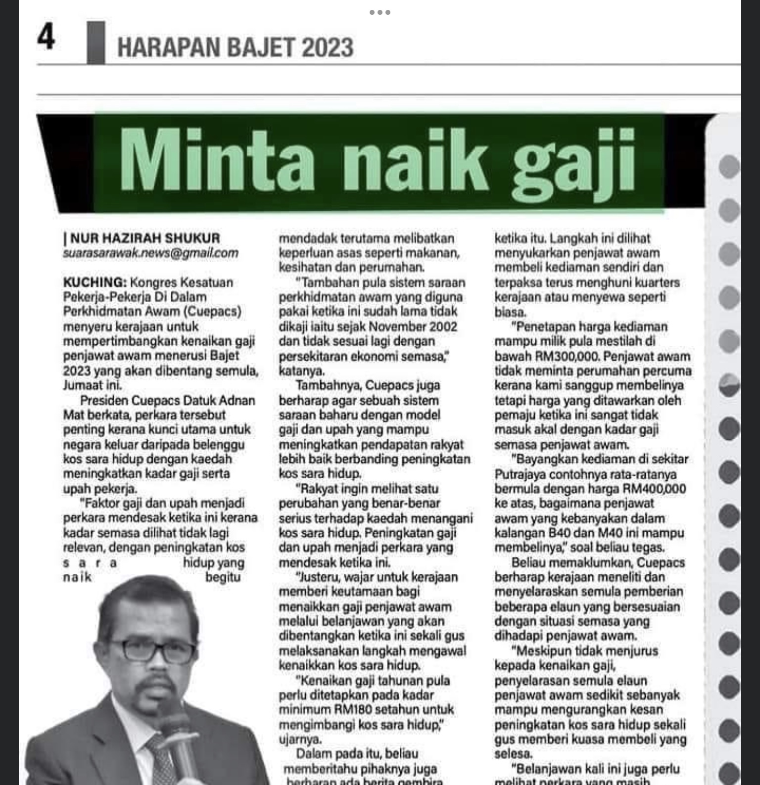 KUALA LUMPUR 24 Feb. – Kongres Kesatuan Pekerja-pekerja Di Dalam Perkhidmatan Awam (CUEPACS) kecewa Belanjawan 2023 yang dibentangkan Perdana Menteri Anwar Ibrahim dilihat tidak mampu menyelesaikan masalah tekanan kos sara hidup yang dihadapi oleh penjawat awam ketika ini. Presiden CUEPACS, Adnan Mat, berkata tiada sebarang komitmen yang diberikan oleh kerajaan untuk menilai semula sistem saraan baharu perkhidmatan awam melalui model gaji dan upah yang mampu meningkatkan pendapatan penjawat awam supaya lebih baik berbanding peningkatan kos sara hidup. “Faktor gaji dan upah menjadi perkara yang mendesak pada ketika ini kerana kadar…