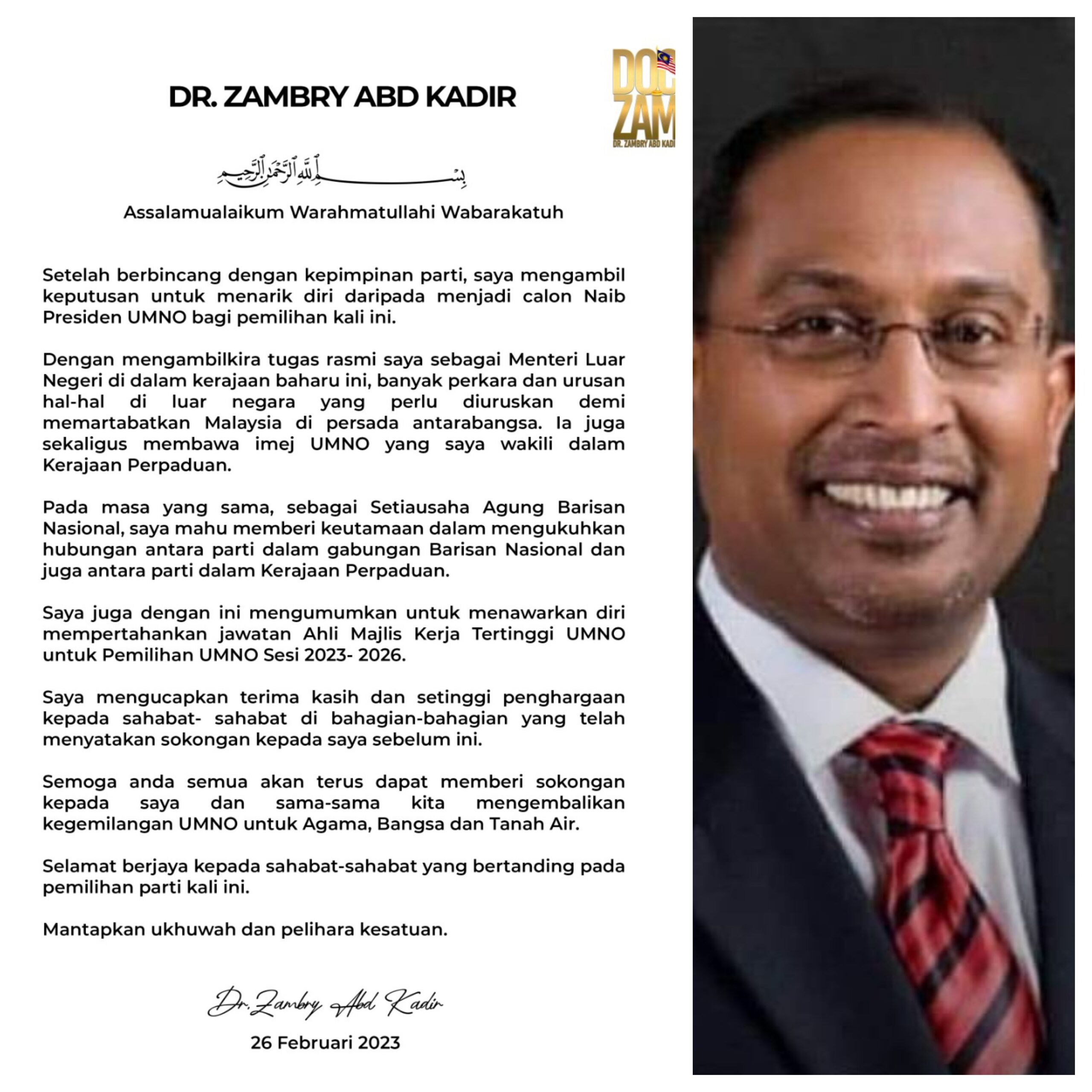 KUALA LUMPUR 27 Feb. – Setiausaha Agung Barisan Nasional (BN) Dr. Zambry Abd Kadir menarik diri daripada bertanding jawatan Naib Presiden UMNO bagi pemilihan parti yang akan berlangsung bulan depan.