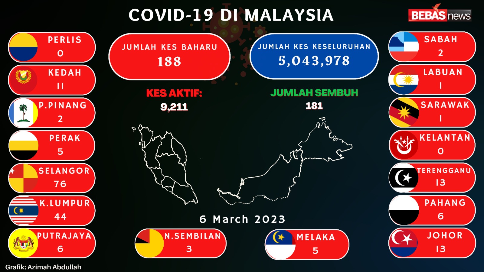 PUTRAJAYA 7 Mac – Jumlah kes jangkitan harian Covid-19 semalam mencatatkan sedikit peningkatan dengan merekodkan 188 kes termasuk tiga kes import berbanding 164 yang direkodkan kelmarin.