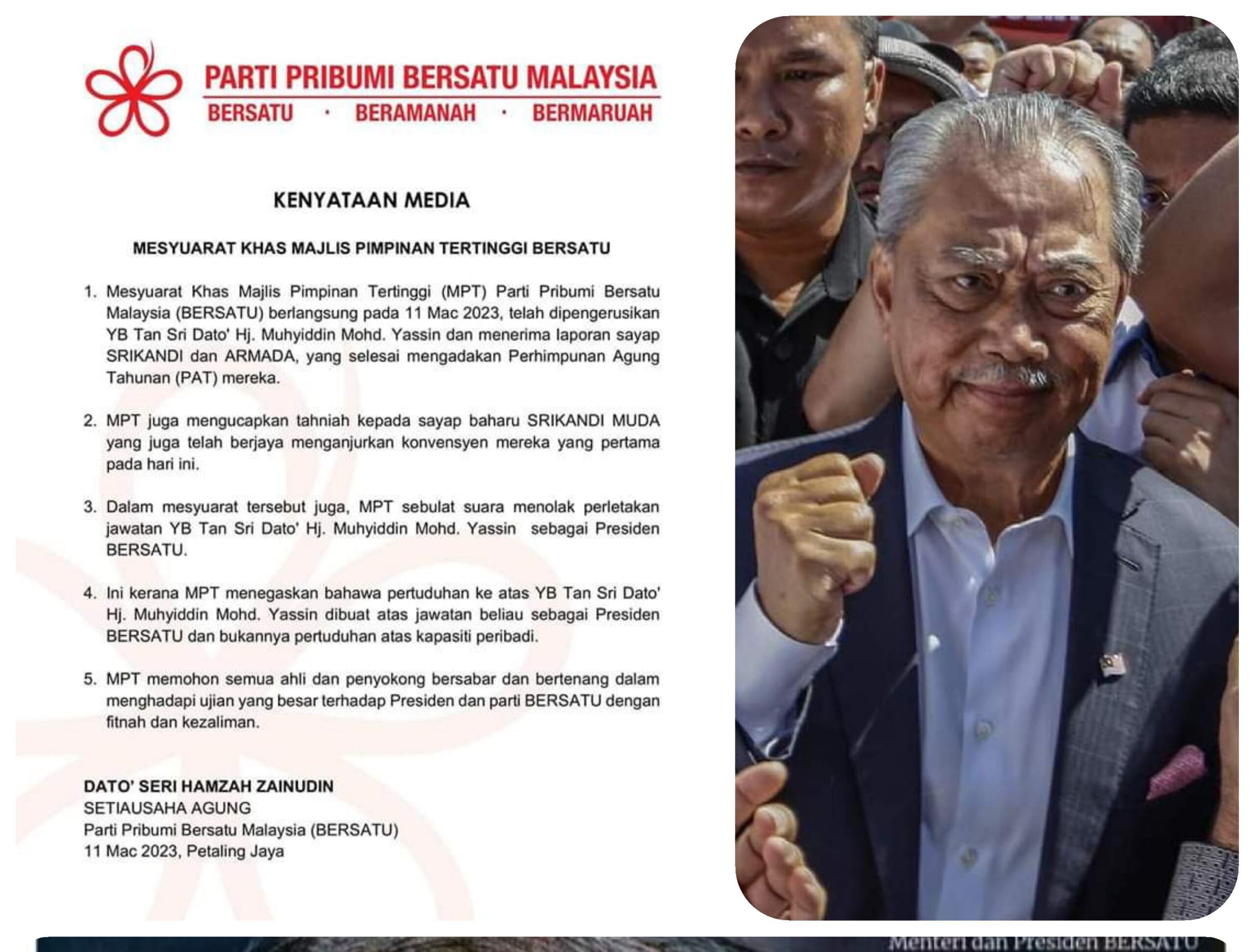 PETALING JAYA 11 Mac – Majlis Pimpinan Tertinggi (MPT) Bersatu bersetuju mengekalkan kedudukan Muhyiddin Yassin sebagai presiden parti itu, kata Setiausaha Agung, Hamzah Zainuddin.