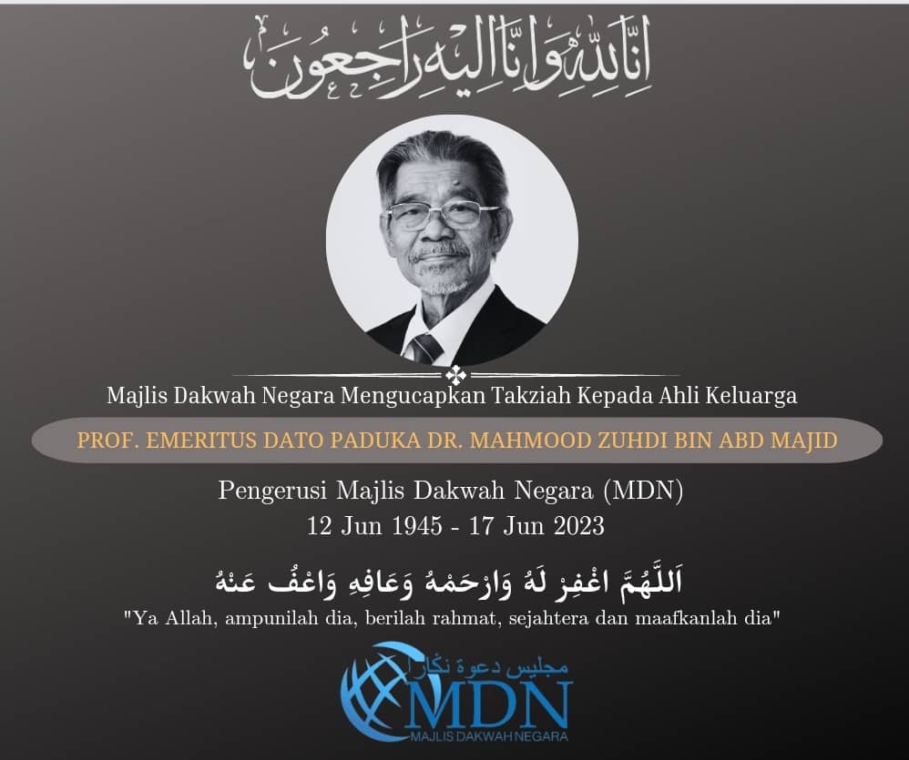 KUALA LUMPUR 17 Jun – Pengerusi Majlis Dakwah Negara (MDN) Prof Emeritus Datuk Dr Mahmood Zuhdi Abdul Majid, 78, meninggal dunia pada pukul 10.20 malam ini.
