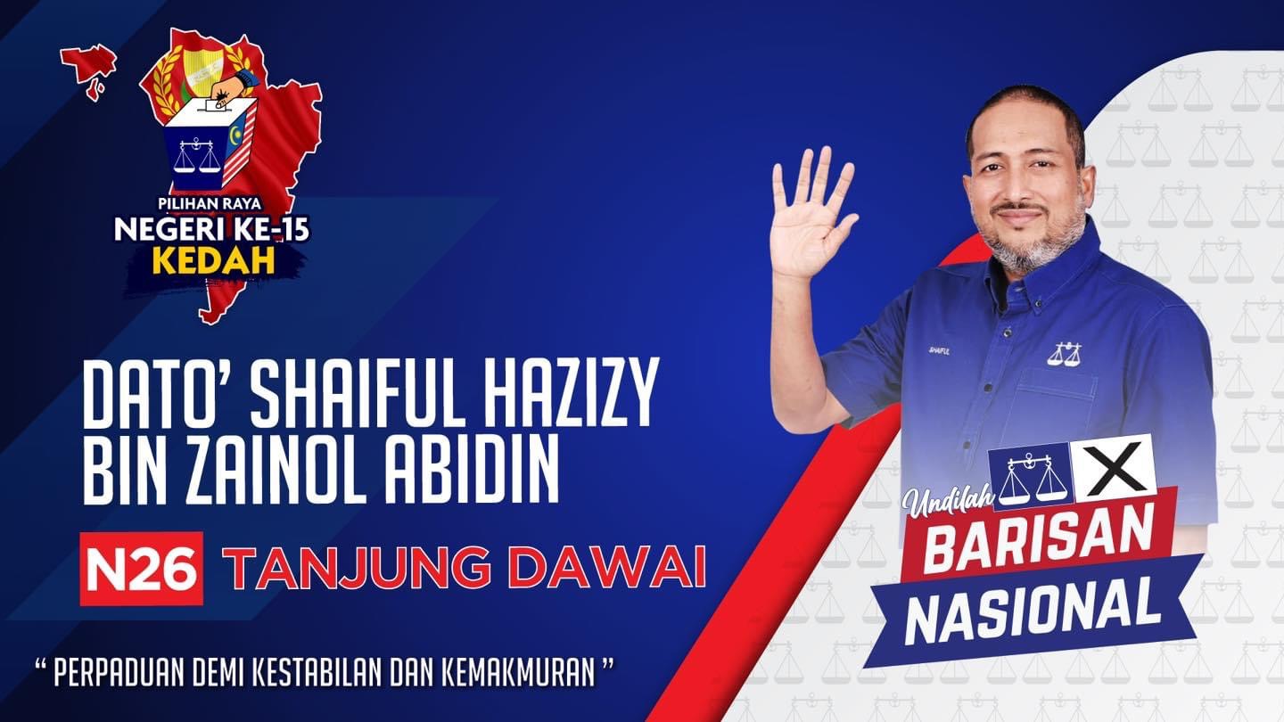KUALA LUMPUR 24 Julai – Ketua UMNO Bahagian Merbok, Datuk Shaiful Hazizy Zainol Abidin dinamakan sebagai calon untuk bertanding kawasan Dewan Undangan Negeri (DUN) Tanjung Dawai pada Pilihan Raya Negeri (PRN) Kedah, 12 Ogos ini. Setiausaha Agung UMNO, Datuk Dr Asyraf Wajdi Dusuki memaklumkan pucuk pimpinan parti bersetuju memilih Shaiful Hazizy bertanding di DUN berkenaan. “Dengan mandat yang diamanahkan oleh Pengerusi BN (Datuk Seri Dr Ahmad Zahid Hamidi), maka Datuk Shaiful Hazizy Zainol Abidin diumumkan sebagai calon bagi kerusi DUN N26, Tanjung Dawai Kedah, (mewakili) BN. “Saya mewakili BN merakamkan penghargaan kepada PH atas semangat perpaduan…