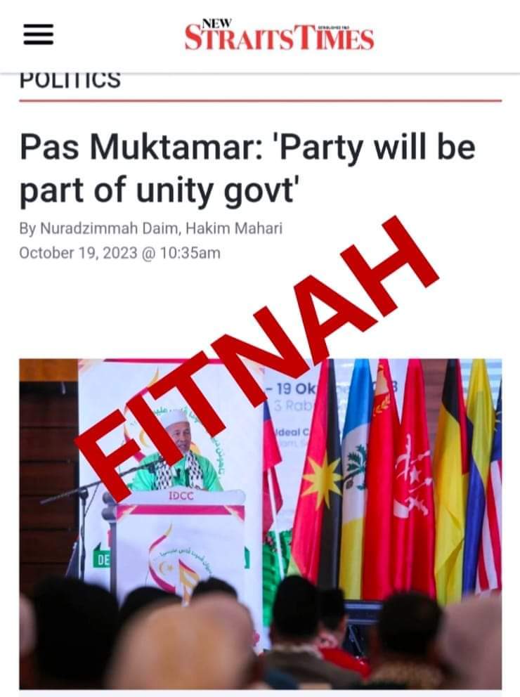 SHAH ALAM 19 Okt. – Pas menafikan laporan berita sebuah media tempatan yang memaklumkan bahawa parti tersebut akan menjadi sebahagian daripada Kerajaan Perpaduan yang terdiri daripada Pakatan Harapan (PH)-Barisan Nasional (BN). Timbalan Presidennya, Tuan Ibrahim Tuan Man berkata, pelaporan berita tersebut jauh berbeza dari konteks ucapan beliau sewaktu perasmian Muktamar Dewan Pemuda Pas semalam, Rabu. “Saya merujuk kepada berita yang dilaporkan oleh NST bertarikh 19 Oktober 2023 yang bertajuk “Pas Muktamar: ‘Party will be part of unity govt’ (Parti (Pas) akan menjadi sebahagian dari Kerajaan Perpaduan”. “Di awal pelaporan berita,…