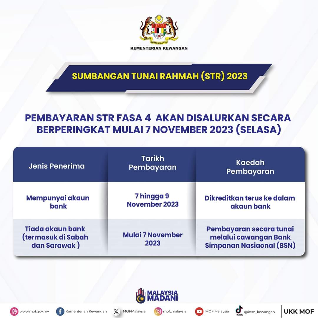 Mulai 1 November 2023, individu yang layak boleh membuat permohonan baharu dan mengemas kini maklumat mereka untuk STR 2024 sepanjang tahun.