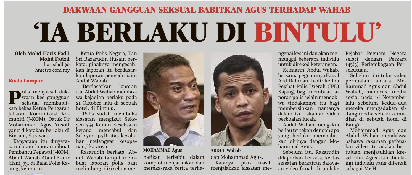 KAJANG: Bekas Ketua Pengarah Jabatan Komunikasi Komuniti (J-KOM), Mohammad Agus Yusoff hadir di Ibu Pejabat Polis Daerah (IPD) Kajang di sini hari ini bagi memberi keterangan. Agus bagaimanapun enggan memberi sebarang kenyataan kepada media yang menunggu sejak pukul 11 pagi dan dilihat keluar menaiki Toyota Estima berwarna putih pada pukul 1.17 petang selepas lebih dua jam masuk ke IPD tersebut. Beliau hanya melambai tangan sambil melemparkan senyuman, manakala peguamnya, Zaflee Pakwanteh yang memandu kenderaan tersebut kemudiannya memberitahu tiada kenyataan akan dibuat. Kehadiran beliau di IPD Kajang hari ini dikatakan bagi…