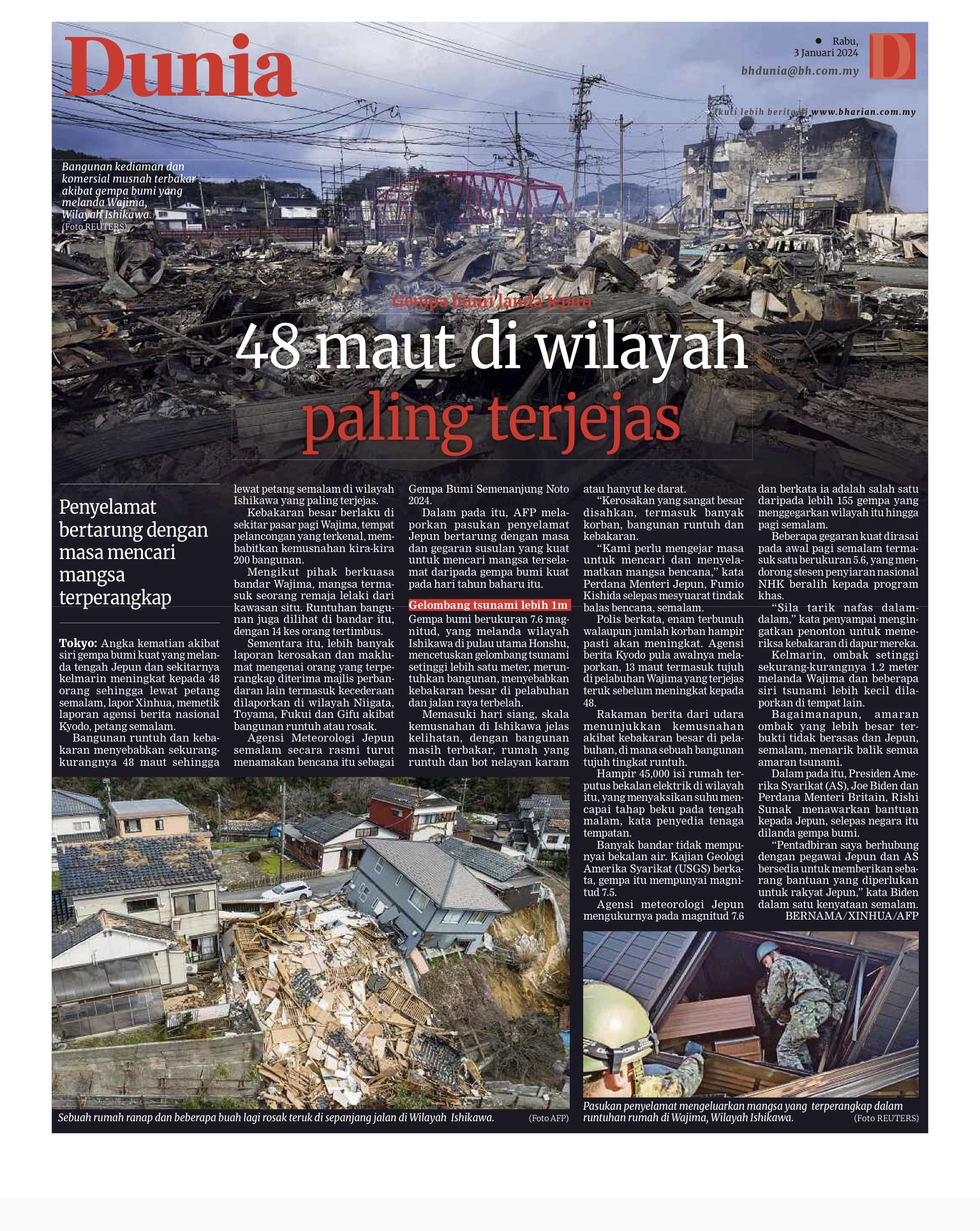 BEIRUT: Timbalan ketua Hamas, Saleh al-Aruri terbunuh bersama pengawal peribadinya selepas Israel menyerang pejuang Palestin di Lubnan, semalam, dengan dron, kata kumpulan dan pegawai keselamatan di Lubnan. Israel, sebelum ini berikrar untuk memusnahkan Hamas selepas serangan 7 Oktober yang tidak pernah berlaku sebelum ini ke atas Israel. Ketika perang, Israel mengumumkan pembunuhan komander dan pegawai Hamas di Gaza, tetapi al-Aruri adalah tokoh paling berprofil tinggi untuk dibunuh, dan kematiannya berlaku dalam serangan pertama ke atas ibu negara Lubnan, sejak perang bermula. Jurucakap tentera Israel, Daniel Hagari tidak secara langsung mengulas…