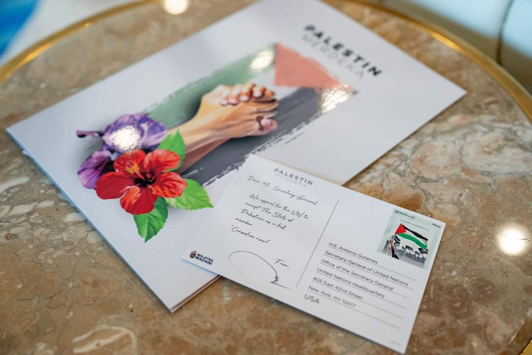 Menerusi hantaran di laman Facebook, Perdana Menteri berkata poskad itu adalah bagi menzahirkan hasrat rakyat Malaysia agar PBB menerima Palestin sebagai negara anggota serta menuntut keganasan dan kezaliman terhadap warga Palestin oleh rejim Zionis dihentikan segera.