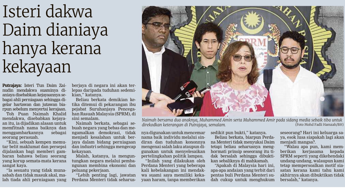 Pada 10 Januari lalu, Nai’mah dan dua anak lelakinya hadir ke ibu pejabat SPRM untuk memberi keterangan serta membantu siasatan agensi antirasuah itu terhadap Daim yang juga seorang ahli perniagaan.