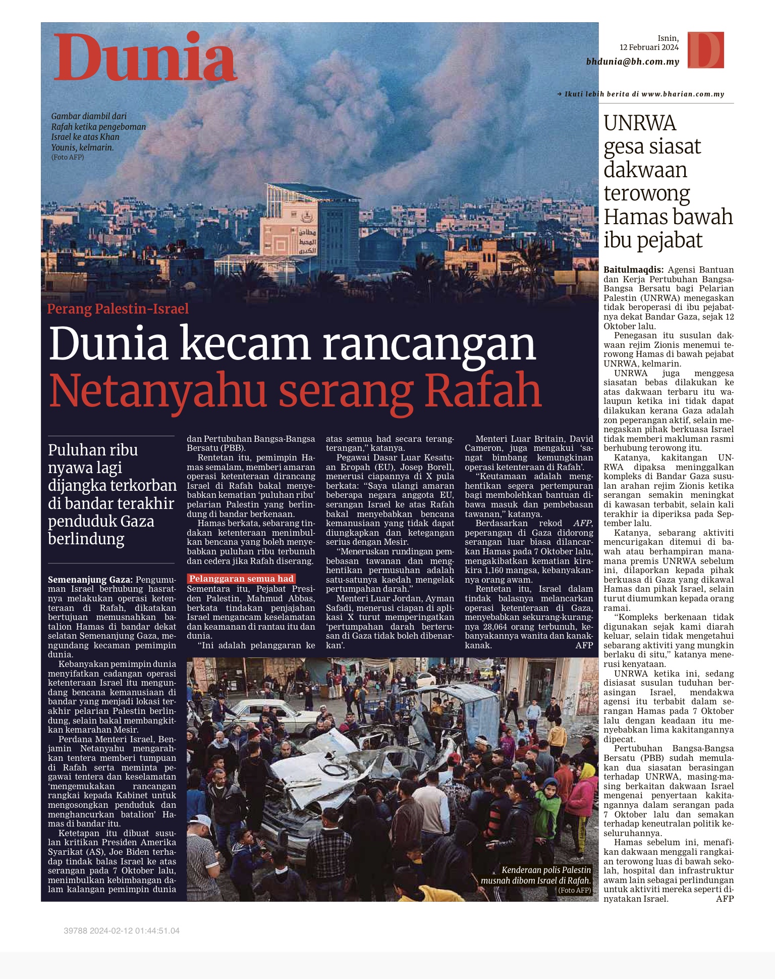 RAFAH: Tentera penceroboh Israel mengebom bandar Rafah di selatan Gaza yang penuh sesak dengan penduduk pada awal pagi ini, menyebabkan lebih 100 orang awam, termasuk kanak-kanak dan wanita terbunuh dengan ratusan lagi cedera. Menurut Agensi Berita Palestin (WAFA), mangsa dikejarkan ke hospital di seluruh bandar itu. Bulan Sabit Merah Palestin pula menyatakan bahawa Rafah sedang menyaksikan peningkatan serangan udara Israel yang tertumpu di pusat bandar yang turut menjejaskan kediaman berhampiran ibu pejabat Bulan Sabit Merah. Pengarah Hospital Kuwait di bandar itu, Suhaib Al-Hams, berkata hospital itu dipenuhi dengan pesakit yang…