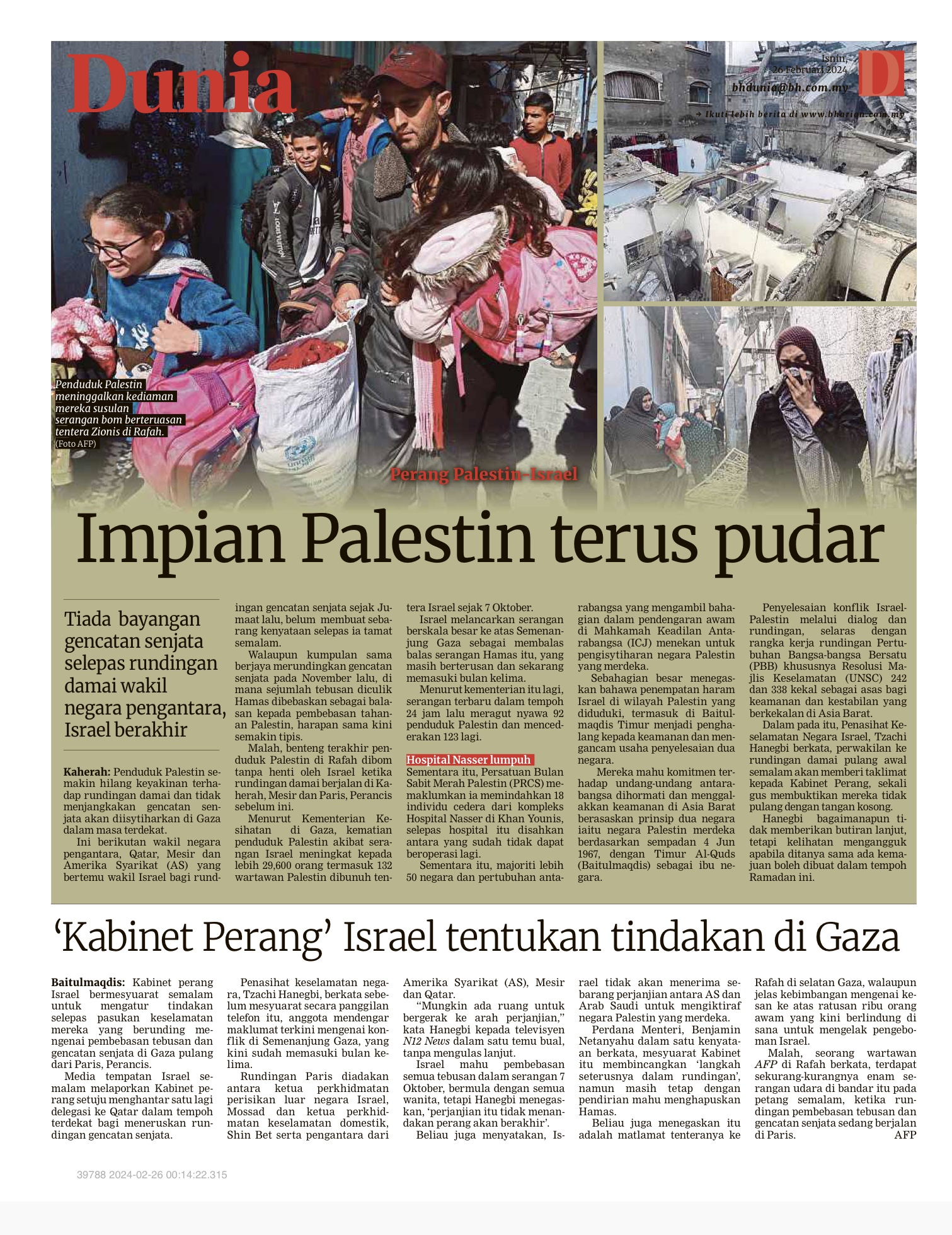 THE HAGUE: Tel Aviv dijangka menyerahkan laporan mengenai langkah diambil bagi menghalang pembunuhan beramai-ramai (genosid) di Gaza seperti diarahkan Mahkamah Keadilan Antarabangsa (ICJ). Tempoh arahan hampir tamat, selepas The Hague menuntut Tel Aviv mengambil langkah mencegah tindakan genosid di bawah Konvensyen Genosid 1948, pada 26 Januari lalu. Walaupun arahan sudah dikeluarkan, sebanyak 3,523 lagi rakyat Palestin terbunuh oleh serangan Israel di Gaza sejak 26 Januari, menjadikan jumlah kematian hampir 30,000 orang kebanyakannya wanita dan kanak-kanak sejak 7 Oktober lalu. Tel Aviv, yang menafikan tuduhan genosid dalam kes yang difailkan Afrika…