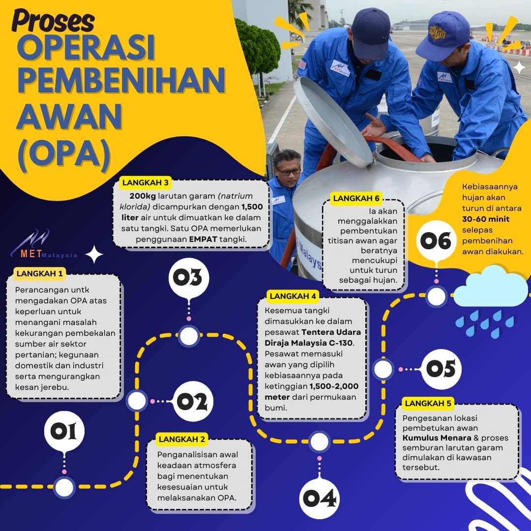 Sementara itu, Pengarah Bahagian Atmosfera dan Pembenihan Awan MetMalaysia, Dr Ahmad Fairudz Jamaluddin berkata untuk OPA, pihaknya menggunakan empat tangki yang diisi 1,000 liter larutan air garam, dan penerbangan operasi bermula pada 2.30 petang ini.