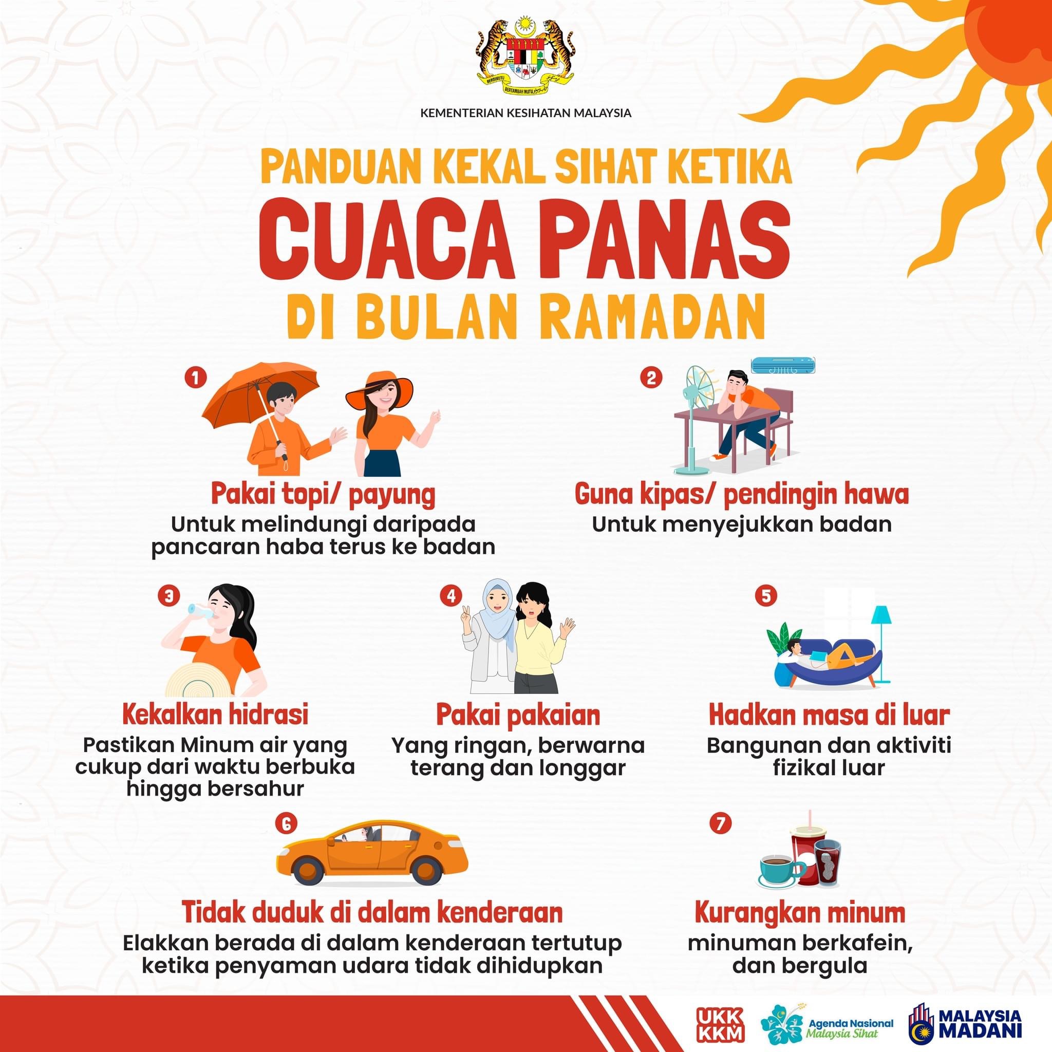 Dr Muhammad Radzi menasihatkan orang ramai untuk mengelakkan diri daripada terdedah secara terus dengan cahaya matahari kerana cuaca ketika ini panas.