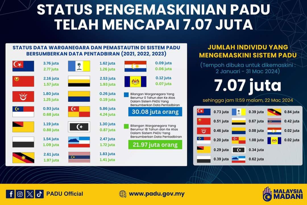 KUCHING 23 Mac – Sarawak meminta beberapa perubahan dibuat berkait maklumat peribadi yang diminta diisi dalam sistem Pangkalan Data Utama (PADU), kata Menteri Pelancongan, Industri Kreatif dan Seni Persembahan, Abdul Karim Rahman Hamzah. Beliau berkata perkara itu dibincangkan dalam mesyuarat Kabinet negeri baru-baru ini berikutan timbul keraguan berhubung maklumat peribadi individu. Katanya, ia bukan bermakna kerajaan Sarawak tidak menyokong inisiatif Kerajaan Persekutuan, tetapi sekadar meminta PADU diteliti semula kerana melihat ada maklumat peribadi yang tidak sepatutnya didedahkan. “Ini membabitkan maklumat peribadi. Jika tiada keraguan, sudah tentu kami akan menyokong PADU,…