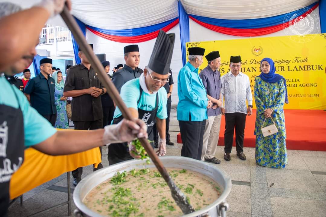 KUALA LUMPUR 28 Mac – Raja Permaisuri Agong Raja Zarith Sofiah berkenan berangkat ke Majlis Pengagihan Bubur Lambuk di Masjid Jamek Kampong Bharu di sini hari ini. Seri Paduka yang tiba pada pukul 10.54 pagi turut berkesempatan meninjau penyediaan bubur lambuk dan beramah mesra dengan petugas. Raja Zarith Sofiah kemudiannya berkenan mengagihkan bubur lambuk kepada 20 wakil masjid dari tujuh zon di Wilayah Persekutuan serta pertubuhan bukan kerajaan (NGO) termasuk golongan mualaf dan Orang Kurang Upaya (OKU). Sejumlah 50 kawah bubur lambuk dimasak secara bergotong-royong seawal 7 pagi melibatkan petugas…