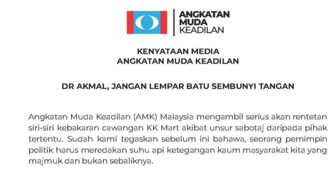 KUALA LUMPUR 1 April – Angkatan Muda Keadilan (AMK) menggesa Ketua Pemuda UMNO, Dr Muhammad Akmal Saleh, mengambil tanggungjawab atas apa yang didakwa ‘ketegangan’ masyarakat kesan kempen boikot yang dilancarkan oleh Pemuda UMNO terhadap kedai serbaneka KK Mart.