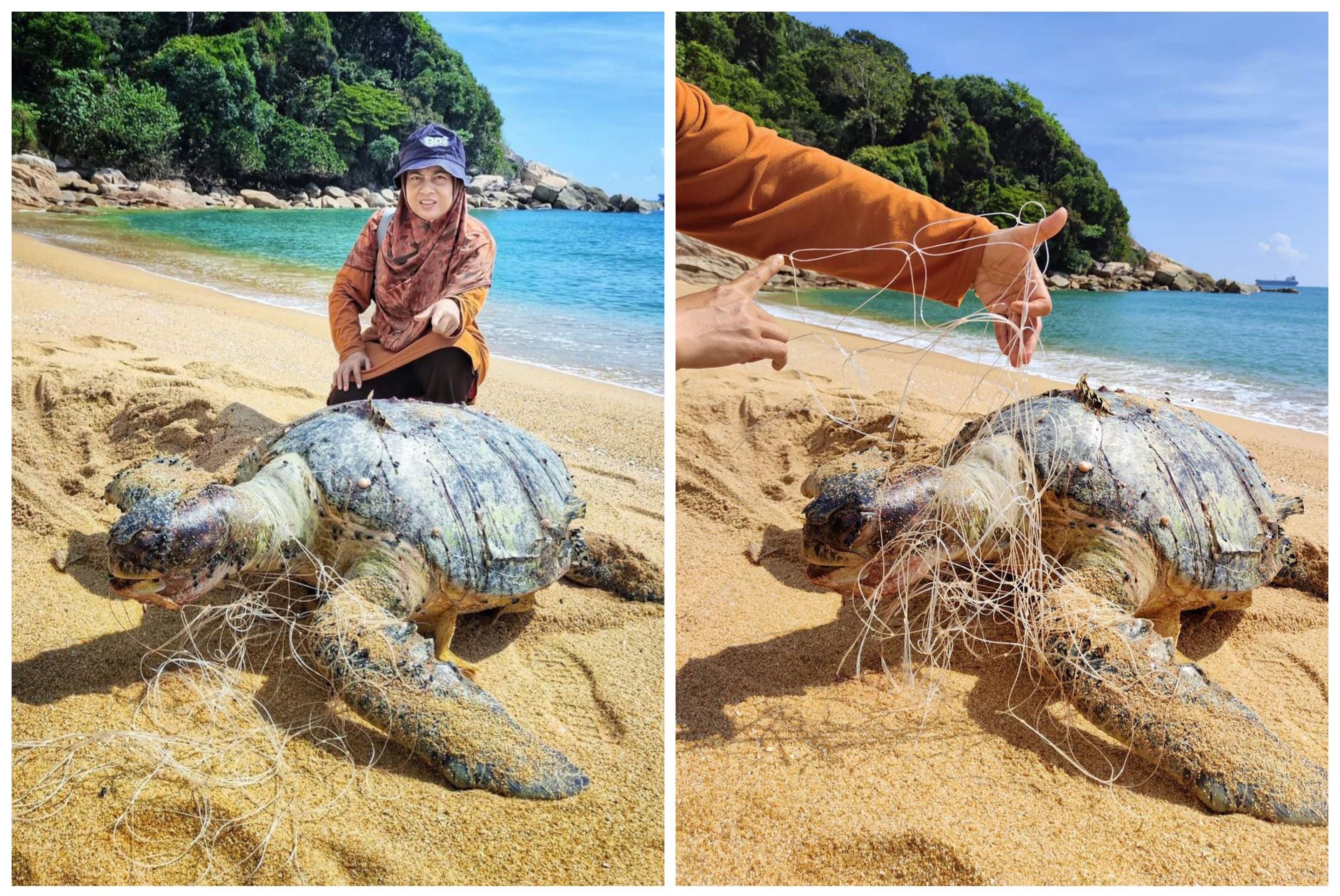 Menurut Facebook Geng Plastik Ija (GPI), kematian penyu itu dipercayai akibat terjerut pukat pari yang dipasang di tengah laut.