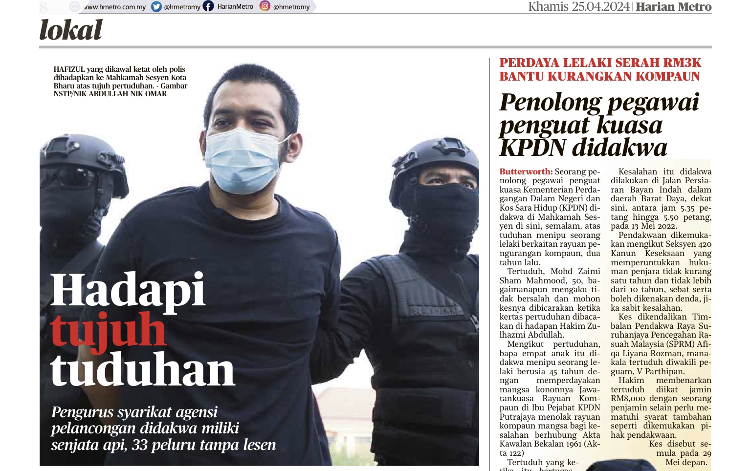 Semalam Hafizul didakwa di Mahkamah Sesyen Kota Bharu, Kelantan, atas tujuh pertuduhan, iaitu memiliki pistol, peluru, mercun bola, tiga MyKad milik individu berbeza dan memandu kereta jenis Honda Civic menggunakan nombor pendaftaran palsu, berdekatan sebuah hospital swasta daerah itu, pada pukul 2 petang, 15 April lalu.