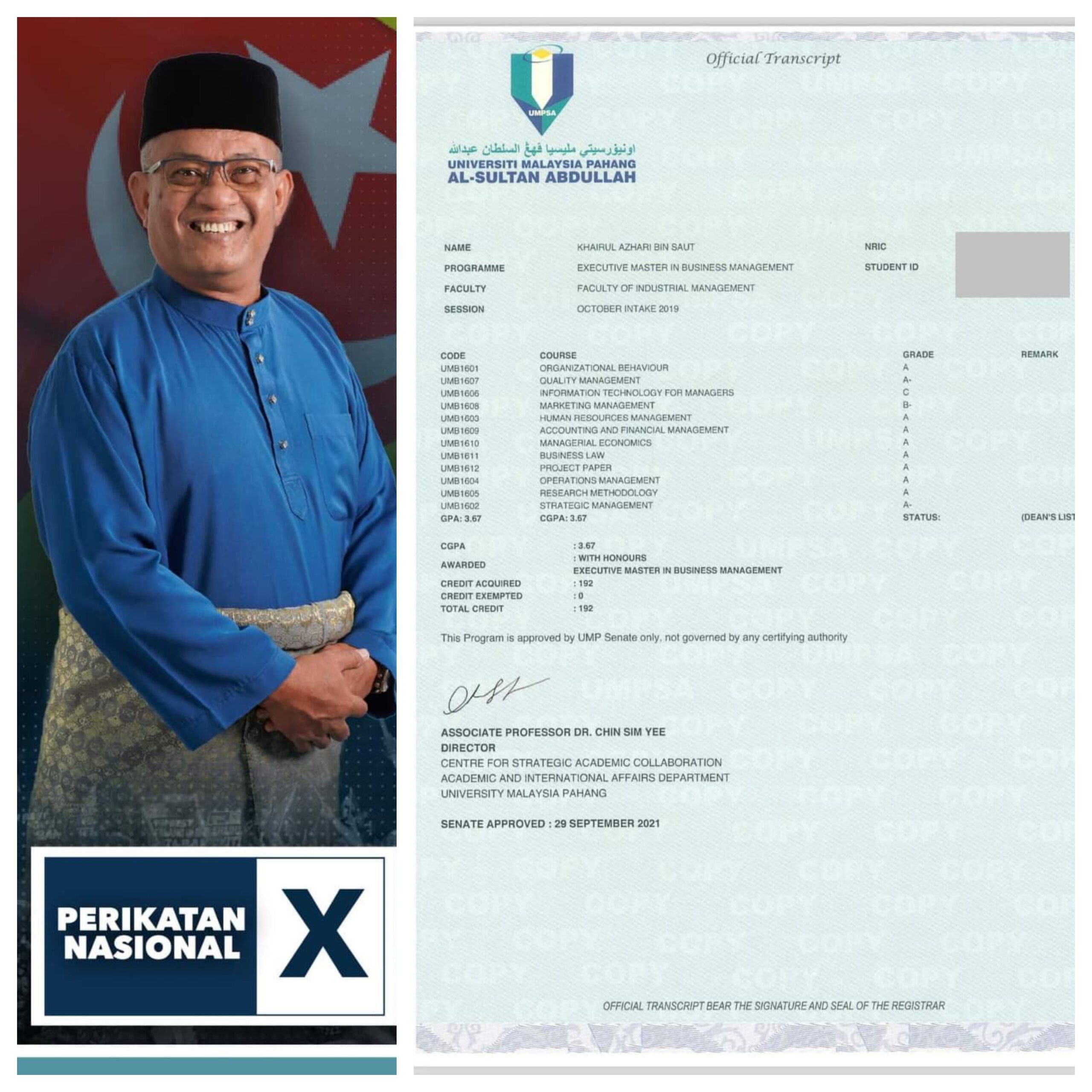 HULU SELANGOR 28 April – Khairul Azhari Saut tampil memuat naik transkrip dan sijil pengajiannya yang memperoleh Ijazah Sarjana Eksekutif Pengurusan Perniagaan, Universiti Malaysia Pahang Al-Sultan Abdullah (UMPSA) pada 29 September 2021. Calon Perikatan Nasional (PN) Pilihan Raya Kecil (PRK) Dewan Undangan Negeri (DUN) Kuala Kubu Bharu itu sebelum ini enggan mengulas mengenai dakwaan pihak tertentu yang mempertikaikan kelulusan dan latar belakang pendidikannya. Beliau yang juga Pemangku Ketua Bersatu Hulu Selangor berkata, tindakannya memuat naik dokumen berkaitan pengajiannya itu bagi mengukuhkan apa yang dinyatakan pihak UMPSA untuk menenangkan ‘kawan…