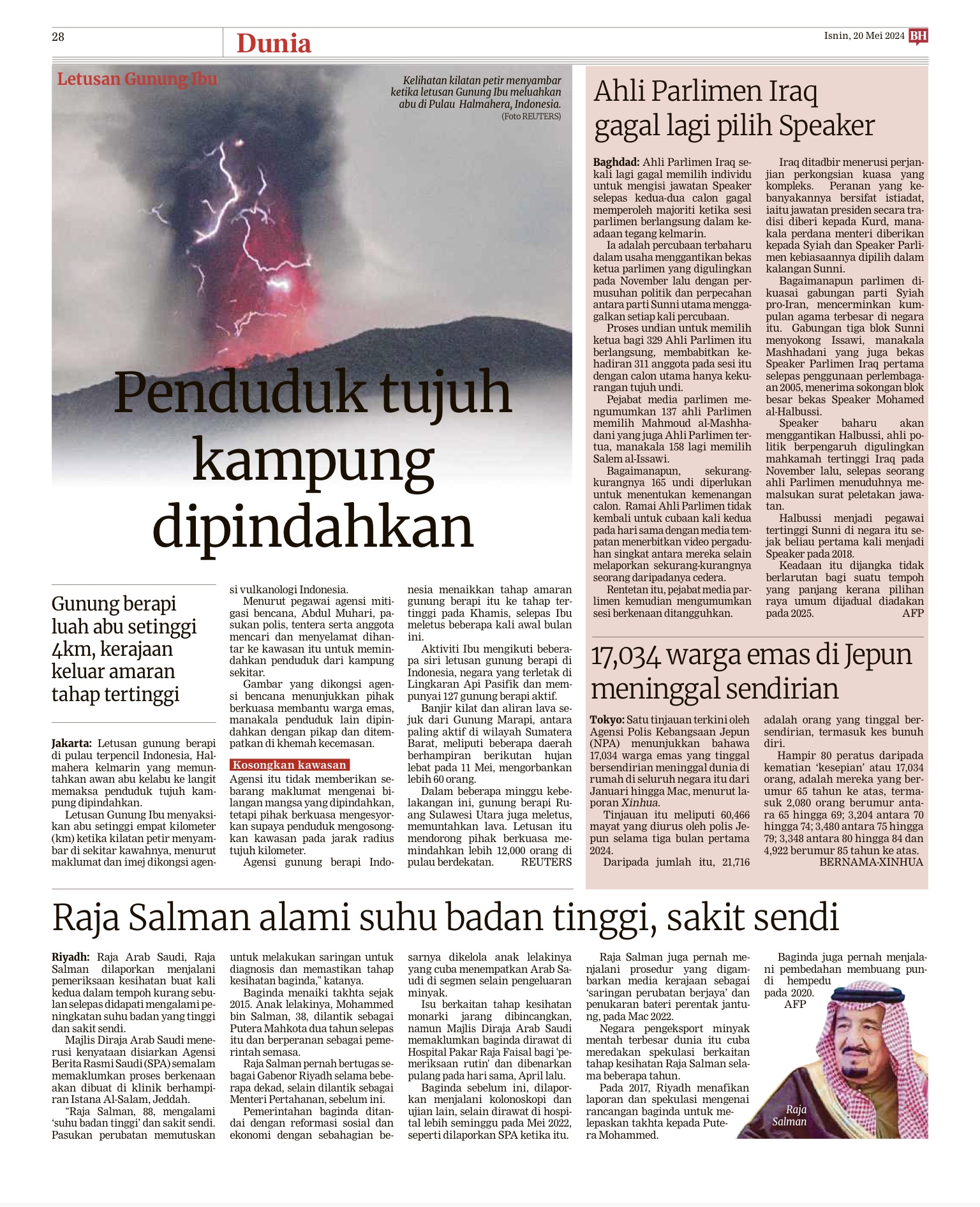 PRESIDEN Iran, Ebrahim Raisi, disahkan maut oleh pegawai kerajaan negara itu dalam nahas helikopter yang terhempas di kawasan berbukit berhampiran sempadan Azerbaijan kelmarin. Media tempatan melaporkan demikian selepas misi mencari dan menyelamat (SAR) dilakukan dalam keadaan ribut salji. Menteri Luar Iran, Hossein Amirabdollahian dan beberapa lagi maut dalam nahas terbabit dan berita kematian itu kemudian disahkan menerusi kenyataan Naib Presiden, Mohsen Mansouri, yang disiarkan di laman sosial dan media tempatan. Stesen televisyen negara itu menyiarkan gambar lokasi, menunjukkan pesawat terbabit terhempas di puncak gunung walaupun tiada kenyataan rasmi menjelaskan punca…
